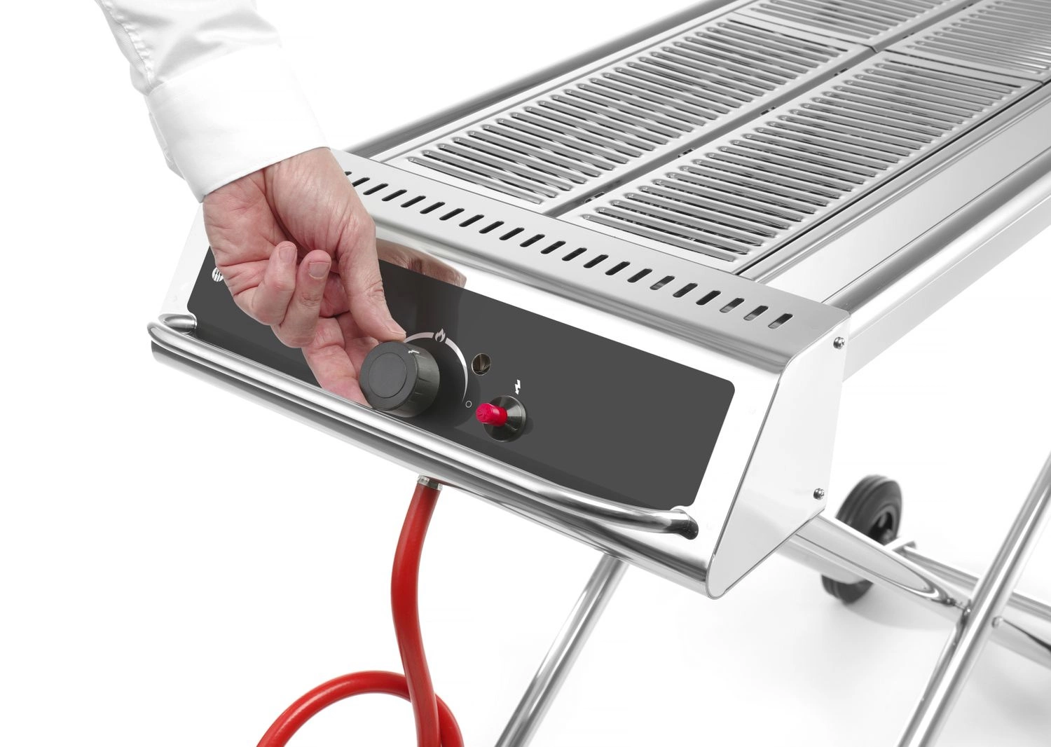 Plynový gril Xenon-Pro na vonkajšie použitie. Ideálne na použitie v záhrade, v reštaurácii, bare alebo na pláži. Vysoko výkonný gril z nehrdzavejúcej ocele. Plochá skladacia základňa s 2 kolieskami umožňuje jednoduchú prepravu a skladovanie grilu. Kryté horáky dosahujú veľmi vysoké teploty, takže môžete grilovať veľké množstvo potravín v krátkomóčase. Ľahko sa čistí vďaka vysokej teplote, ktorú dosahuje. Gril je vybavený termočlánkom, elektronickým zapaľovaním a plynovým potrubímód s regulátorom tlaku. Grilovacia plocha 86x26 cm (2 rošty 43x26 cm).