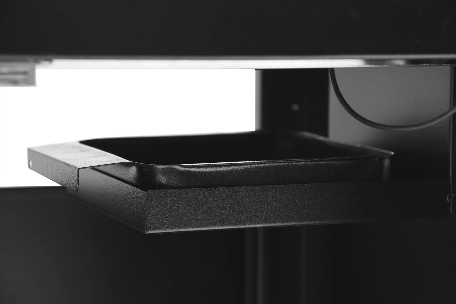 • Bočné police s háčikmi a priestranná uzatvárateľná skrinka na uloženie príslušenstva.