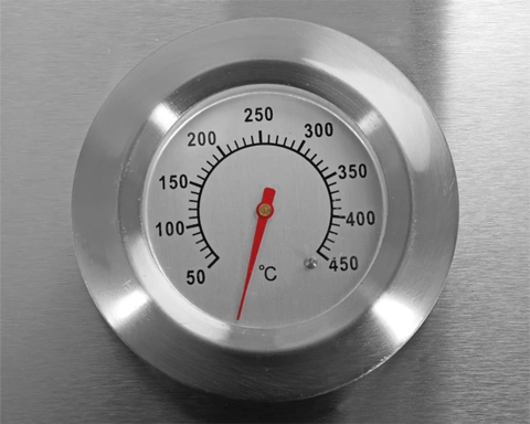 Kryt z nehrdzavejúcej ocele s teplomerom zaručuje optimálnu kontrolu teploty a ochranu pred vetrom.