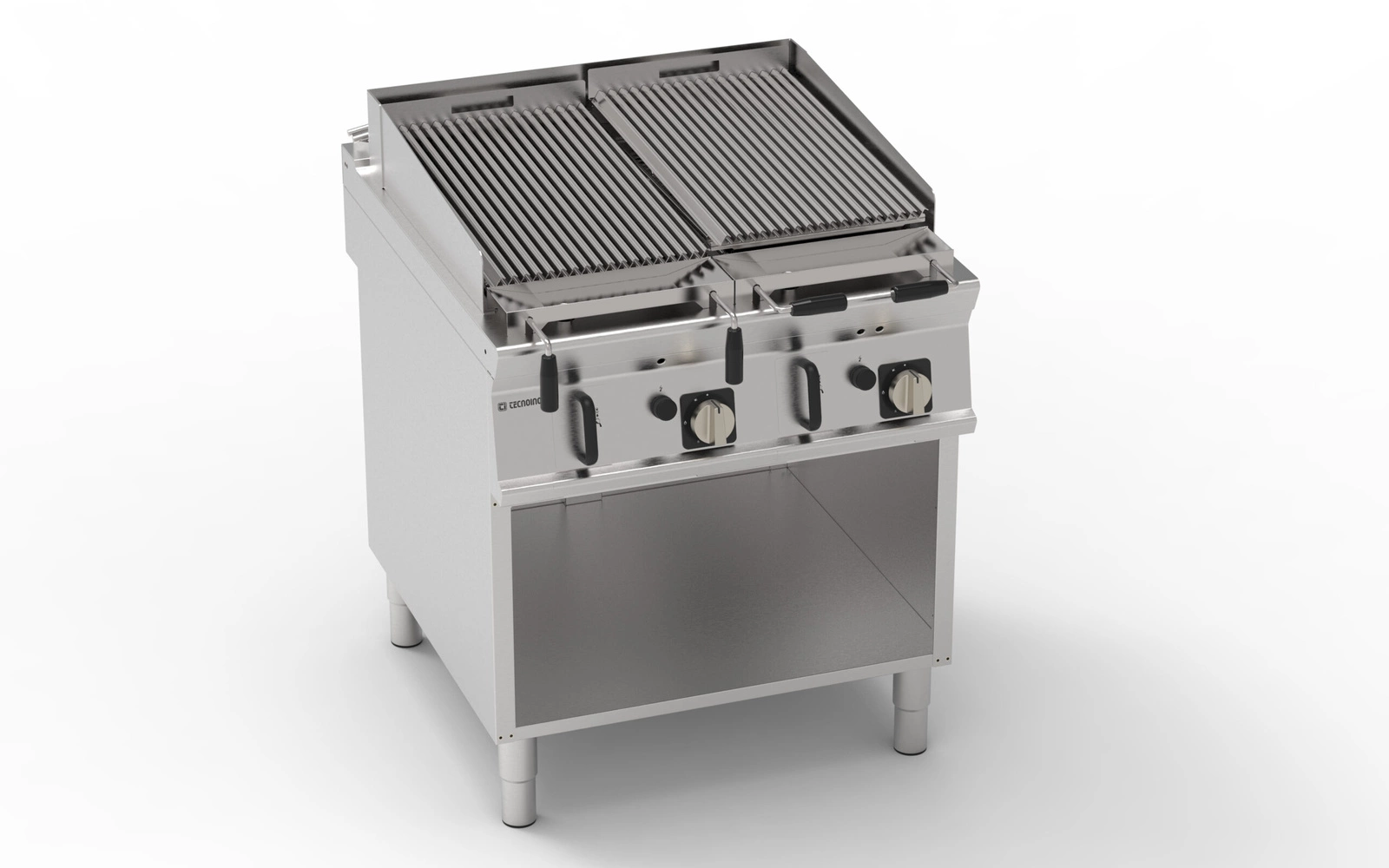 Lávový gril TECNOINOX 313208 je profesionálne zariadenie na intenzívne grilovanie, ktoré je súčasťou kuchynského radu Tecno90. Funguje na princípe nahrievania lávových kameňov plynovými horákmi - kamene rovnomerne vydávajú teplo, čím zabezpečujú konštantnú teplotu a charakteristický grilovací efekt. Zariadenie je osadené na robustnej otvorenej skrinke, ktorá ponúka ďalší úložný priestor.