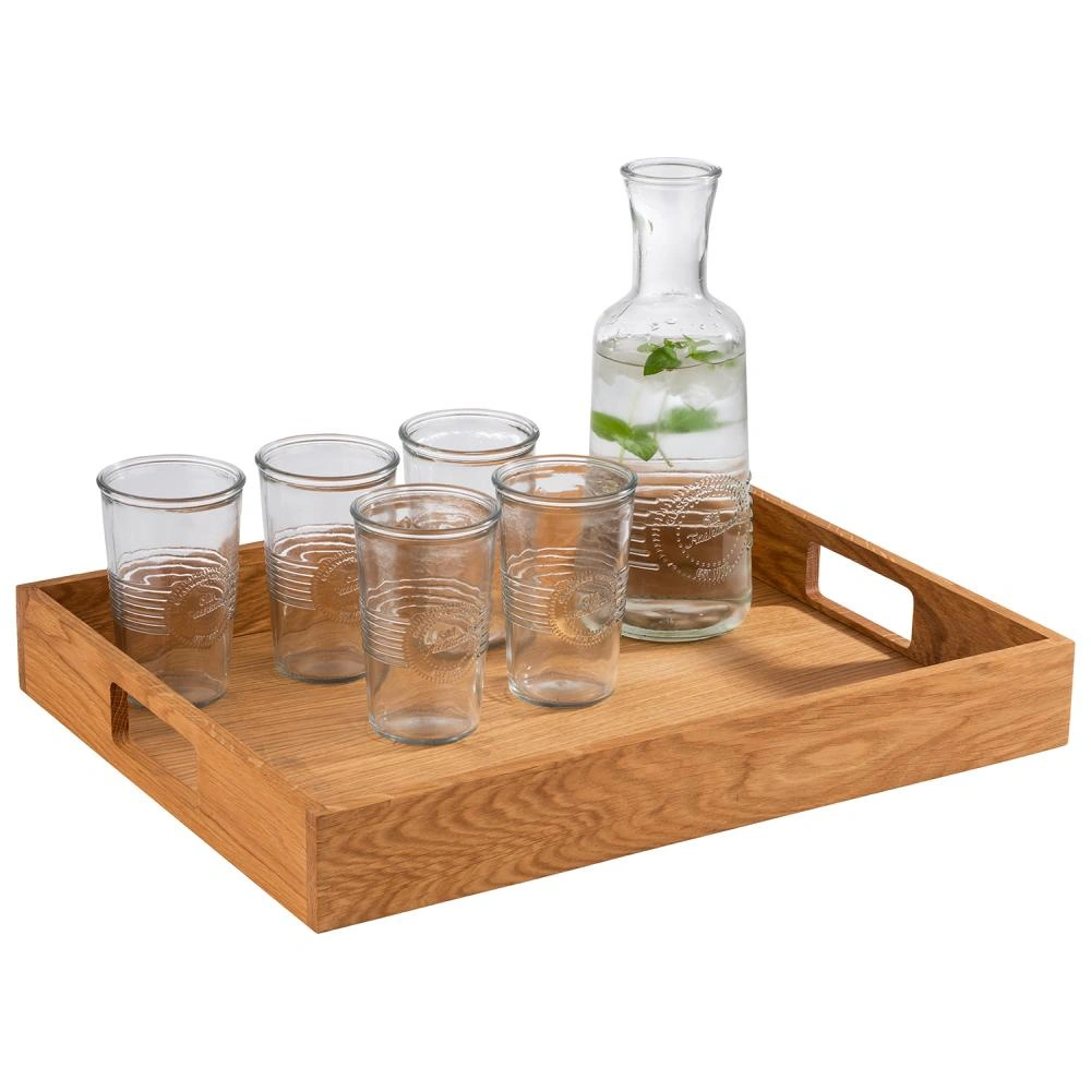 Produkt je vyrobený z vysoko kvalitného dubového dreva, ktoré je starostlivo opracované a olejované na ochranu povrchu. Pohodlné, ergonomicky tvarované úchyty uľahčujú prenášanie tácky a vhodná výška okrajov chráni pred náhodným skĺznutím riadu alebo občerstvenia. Celok sa vyznačuje pevnosťou a estetickým vzhľadom, čo z neho robí praktický doplnok na každodenné použitie.