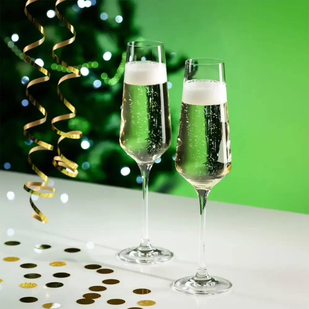 - Elegantný dizajn – Štíhla čaša na vysokej stopke nielenže pôsobivo vyzerá na stole, ale tiež umožňuje dlhšie uchovanie bubliniek v šampanskom, čím zvýrazňuje jeho aromatické a chuťové prednosti.