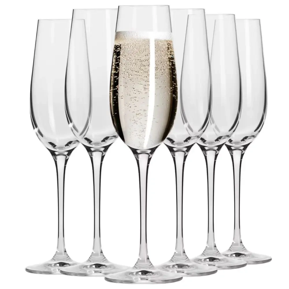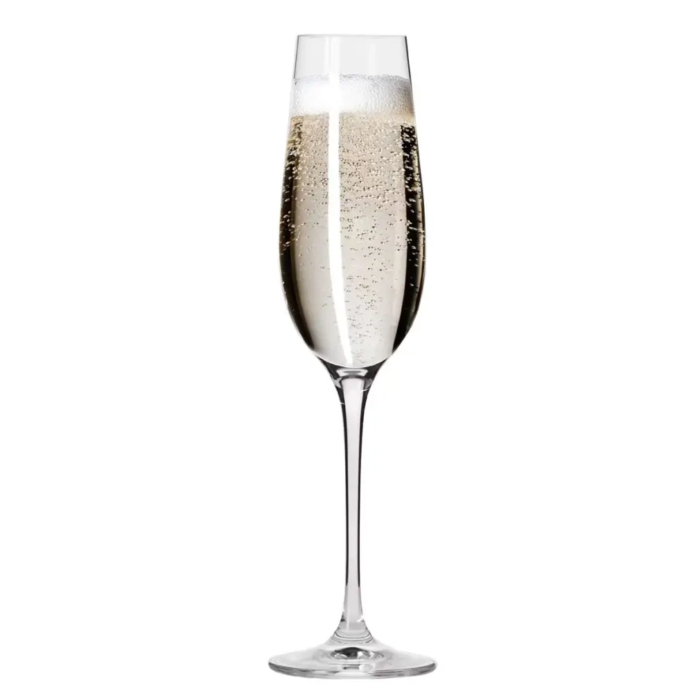 • Premyslená konštrukcia – štíhla čaša s jemným zúžením v hornej časti umožňuje dlhšie zachovať sviežosť a arómu nápoja, zatiaľ čo dlhá, stabilná stopka zabraňuje ohrievaniu nápoja rukou. Vďaka tomu si šampanské či iné šumivé vína zachovávajú svoje najlepšie chuťové vlastnosti počas celej degustácie.
