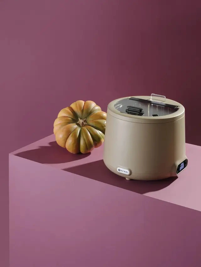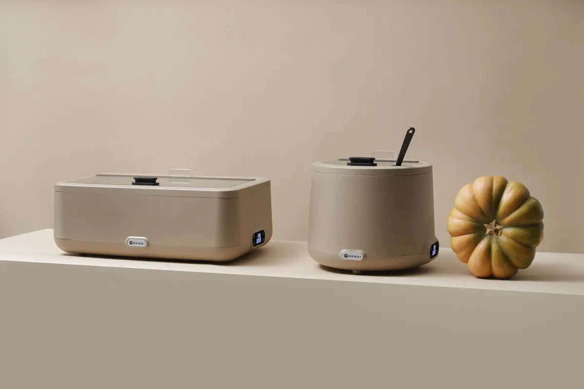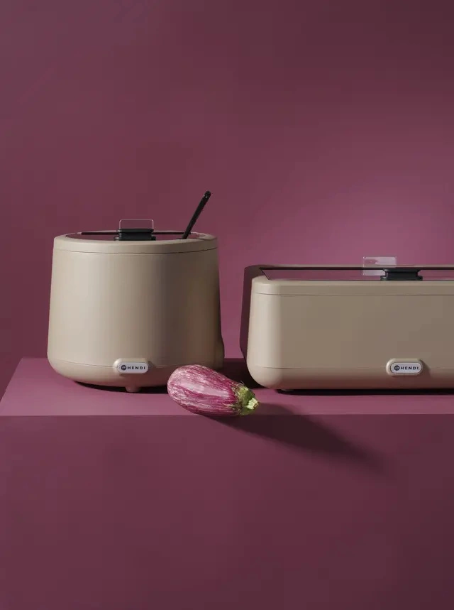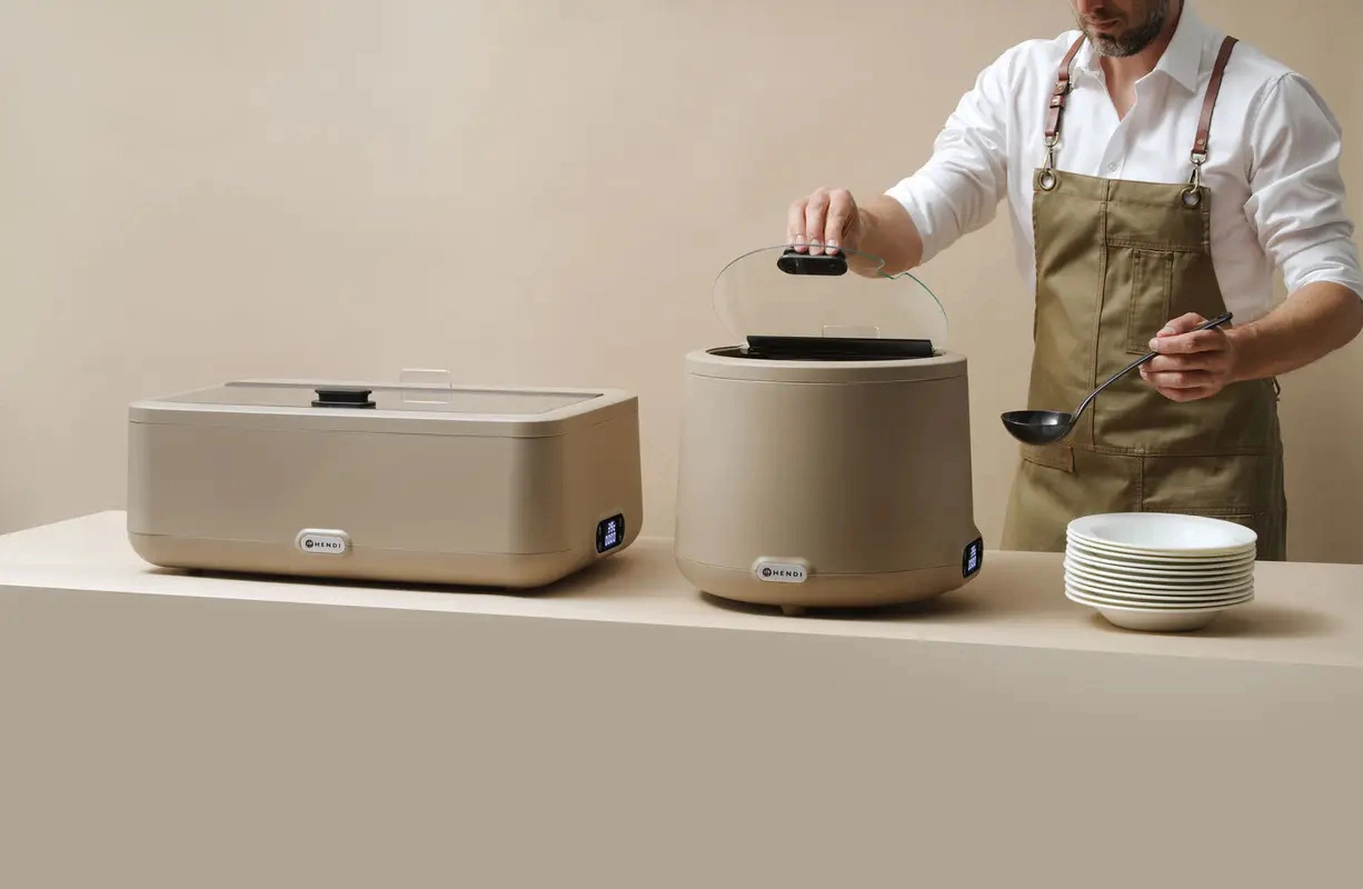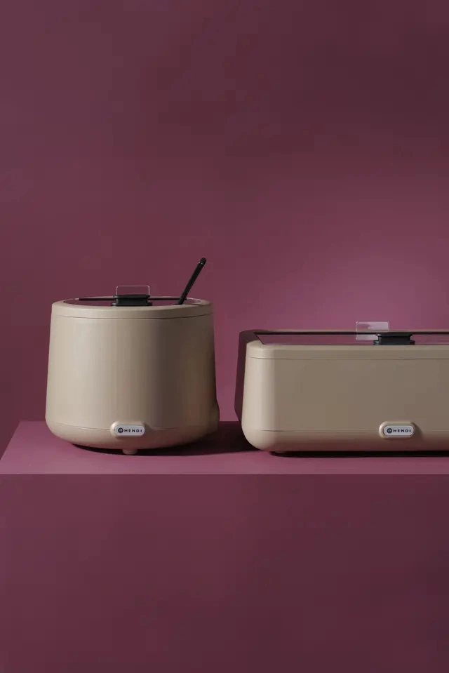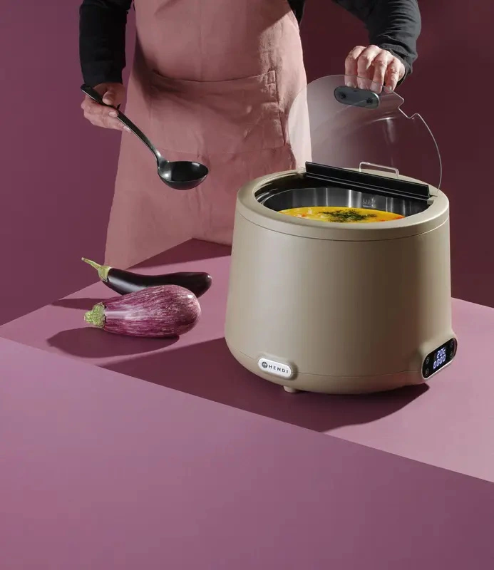 Kotlík na polievku HENDI UNIQ je moderné a štýlové zariadenie, ktoré navrhol uznávaný holandský dizajnér Robert Bronwasser. Vďaka svojmu elegantnému dizajnu upúta pozornosť na každom bufete a zároveň poskytuje vysokú funkčnosť a pohodlie. Poskytuje ľahkosť a jednoduchú prepravu, vďaka čomu je ideálny pre catering. Prístroj ohrieva polievky metódou vodného kúpeľa, ktorá minimalizuje riziko prehriatia a zabezpečuje rovnomerné udržiavanie ideálnej teploty pri servírovaní. Elektronický ovládací panel s displejom umožňuje presnú kontrolu teploty a prevádzkového času a posledné nastavenia ohrevu sa automaticky zapamätajú pre jednoduchú obsluhu. Kotlík má aj praktické dvojdielne veko s izolovanou rukoväťou a výrezom na naberačku, ktoré znižuje tepelné straty pri otváraní a zvyšuje hygienu.