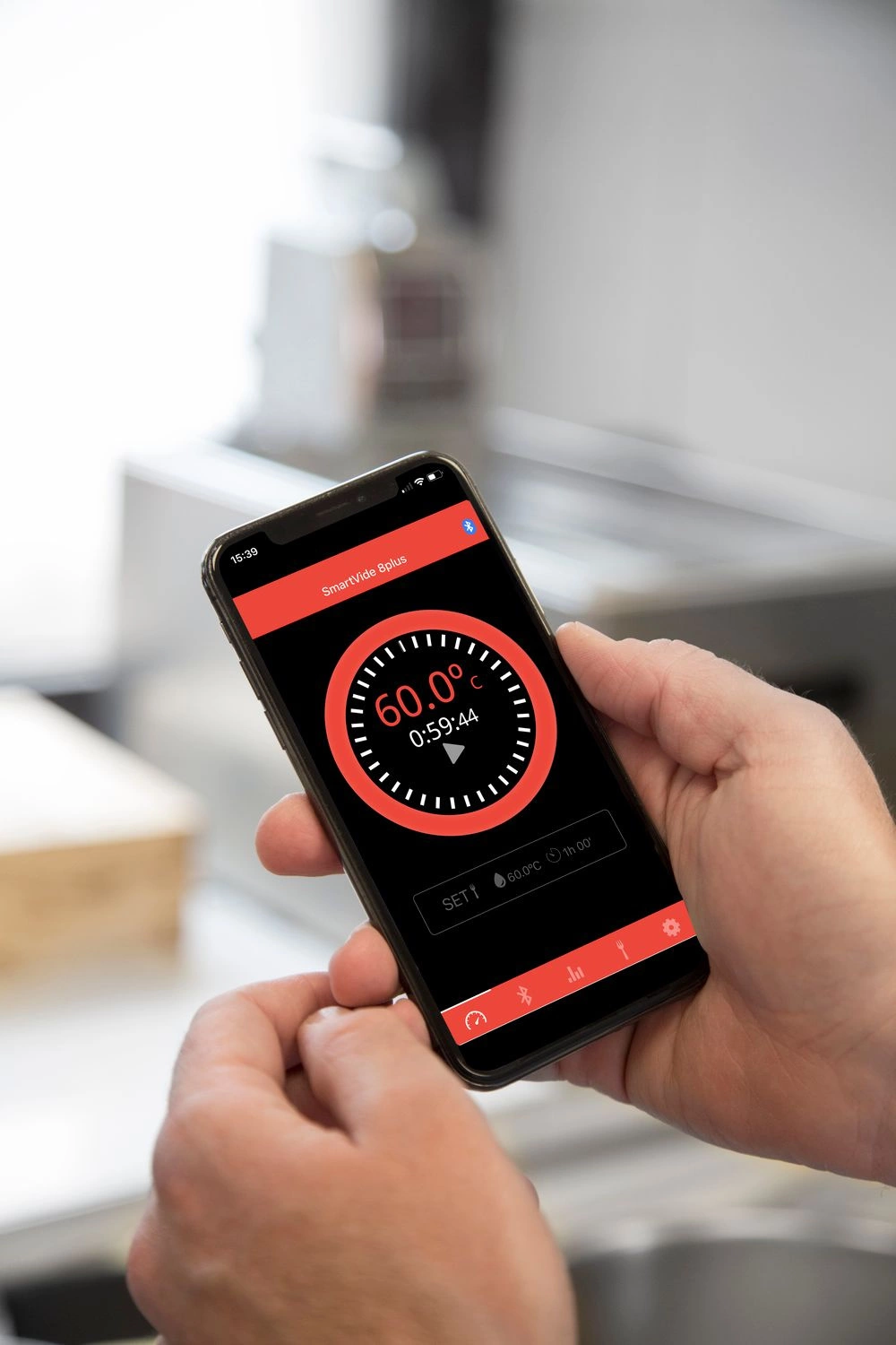 Ponorné cirkulačné čerpadlo na varenie SOUS-VIDE "SMARTVIDE 5". Má pripojenie Bluetooth, ktoré zjednodušuje proces varenia a umožňuje aktualizáciu softvéru. Po každom ukončenom cykle je možné exportovať a vytlačiť parametre procesu varenia. Intuitívne ukladanie prispôsobených programov varenia so zohľadnením teploty a času. Miešadlo v zariadení uvádza vodu do pohybu, takže teplota zostáva konštantná. Sonda umožňuje kontrolovať teplotu vo vnútri výrobku. Má intuitívny ovládací panel a 3,5" vodotesný displej. Indikátor minimálnej hladiny vody chráni obehové čerpadlo pred poškodením, pretože sa nezapne, keď v nádobe nie je minimálna požadovaná hladina vody.