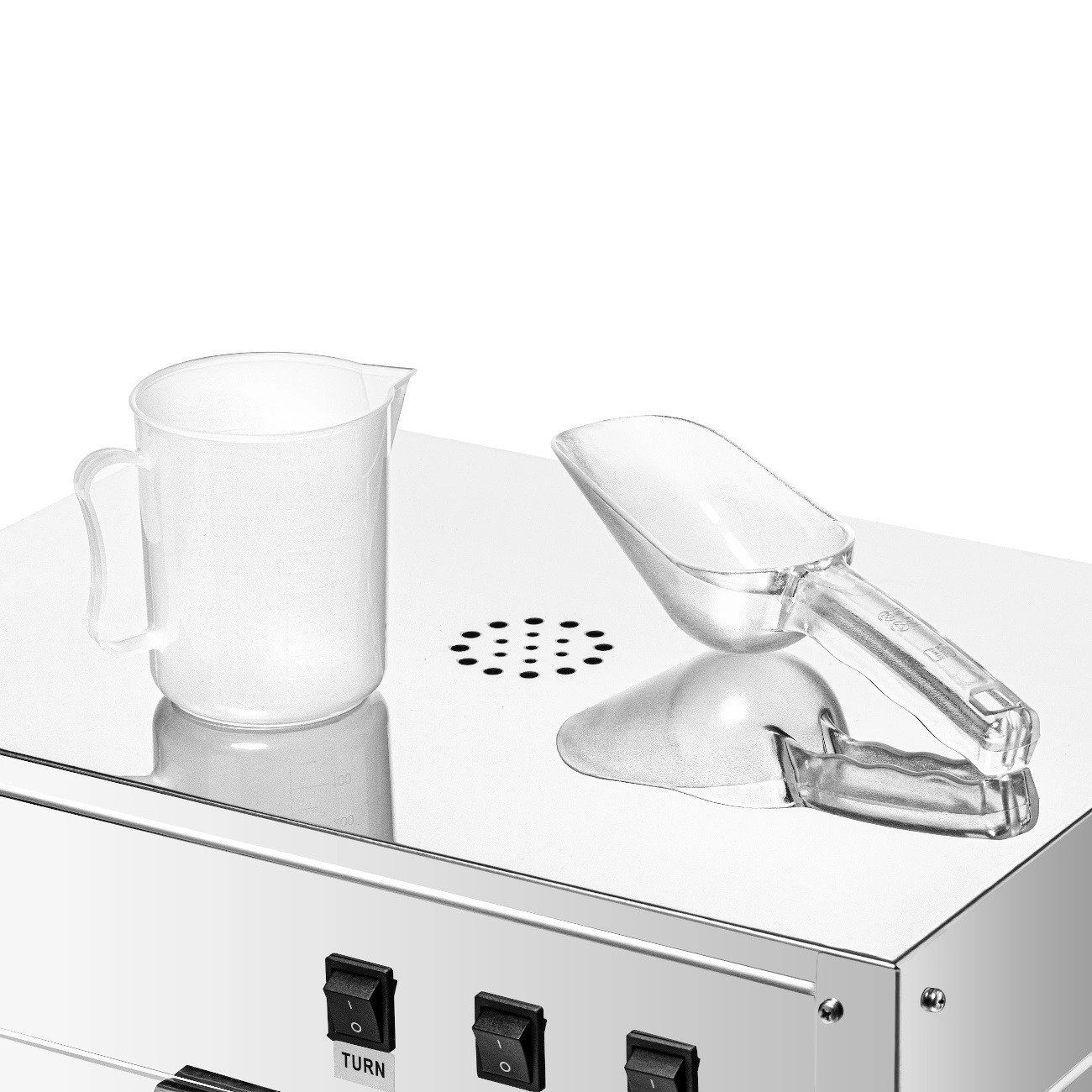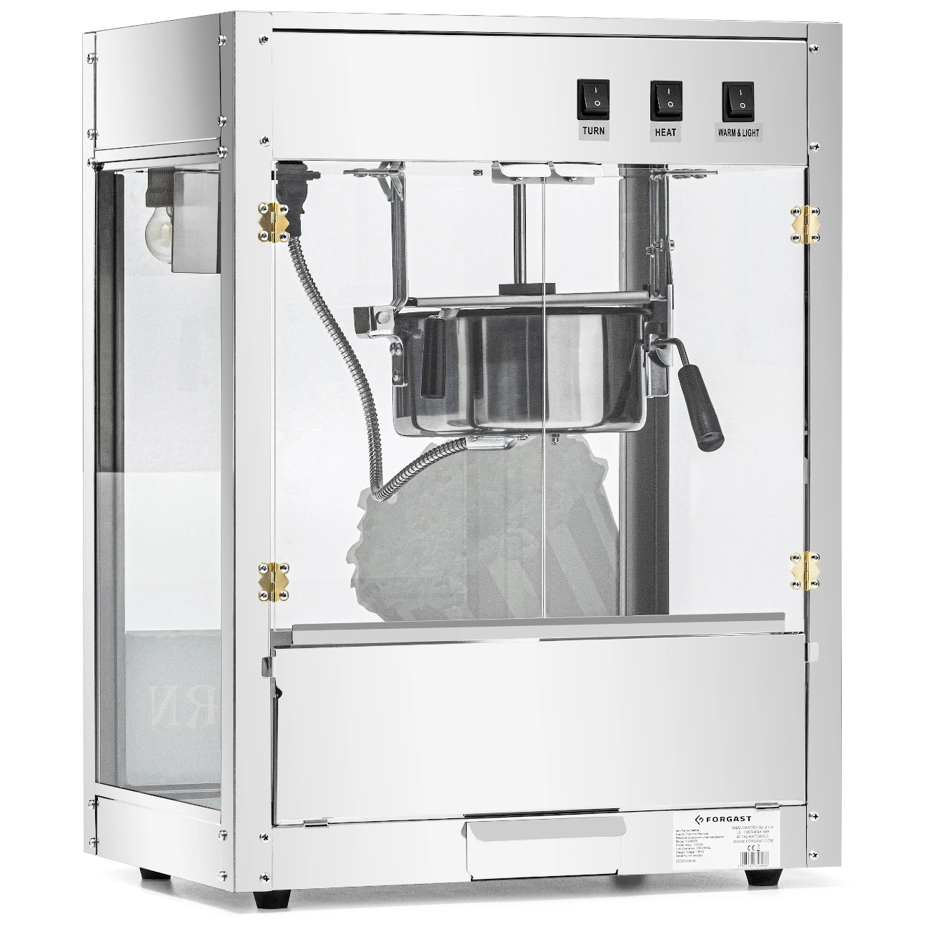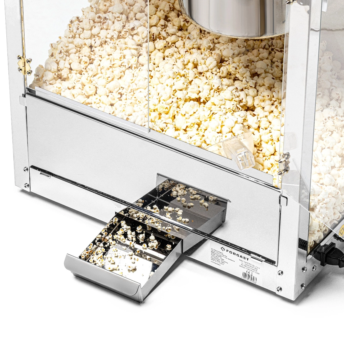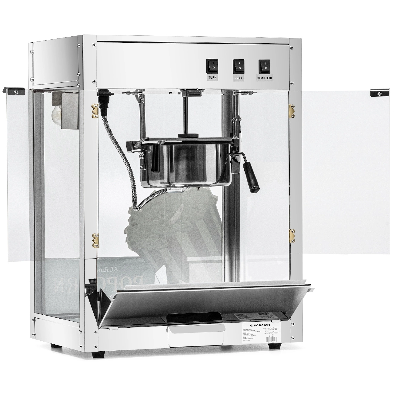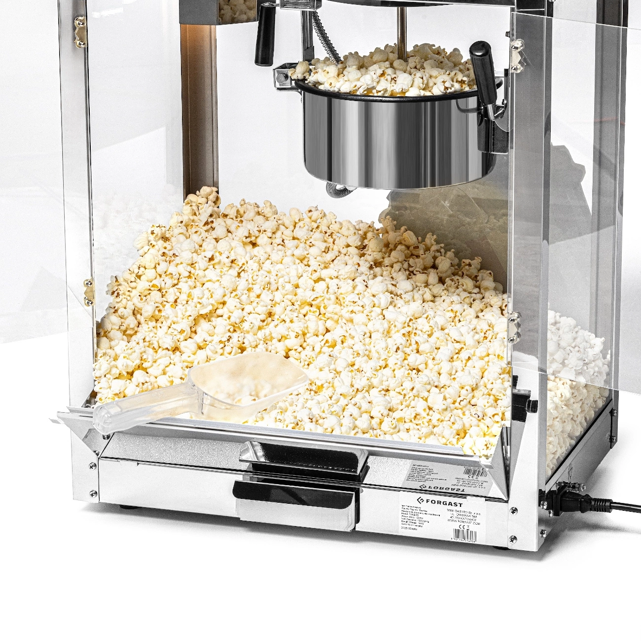 Stroj na popcorn FORGAST FG09305 je ideálny pre profesionálne použitie na miestach s vysokou frekvenciou návštevníkov, ako sú kiná, eventové stánky, bary alebo food trucky. Zariadenie je vybavené vnútorným osvetlením, čo zlepšuje viditeľnosť hotového popcornu a motivuje zákazníkov k nákupu. Súčasťou balenia je lopatka s objemom 220 ml a dávkovač 500 ml, ktoré uľahčujú rýchle dávkovanie a podávanie produktu. Dvierka z akrylu a steny z tvrdeného skla zabezpečujú bezpečnosť a umožňujú pôsobivú prezentáciu popcornu.