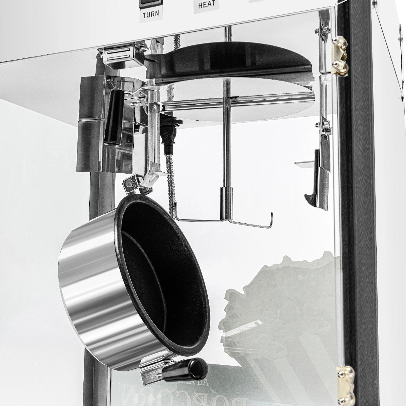 - Presná regulácia teploty – Zabudovaný termostat zabezpečuje stálu prevádzkovú teplotu, čo ovplyvňuje rovnomerné ohrievanie a kvalitu hotového popcornu.