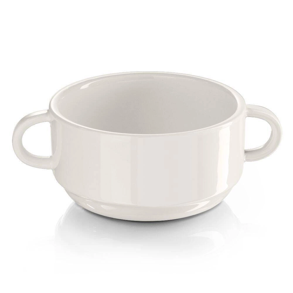 Bulionówka porcelanowa Modermo Prima MODERMO MP001 to eleganckie naczynie stworzone z myślą o profesjonalnym i domowym serwowaniu zup, bulionów oraz kremów. Wyróżnia się klasycznym śmietankowym kolorem, dwoma wygodnymi uszkami oraz możliwością sztaplowania, co czyni ją niezwykle praktyczną zarówno w restauracji, jak i w domowej jadalni.