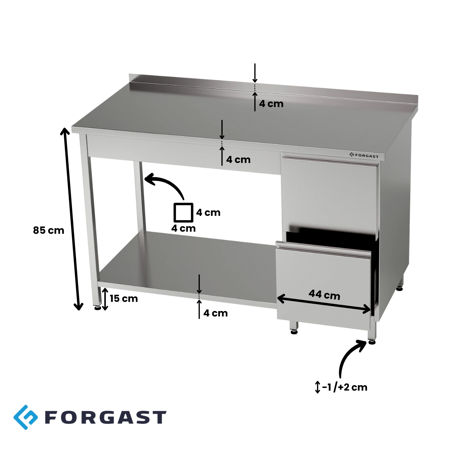 Pracovný stôl z nehrdzavejúcej ocele s blokom zásuviek a spodnou policou 180x70x85 cm | FORGAST