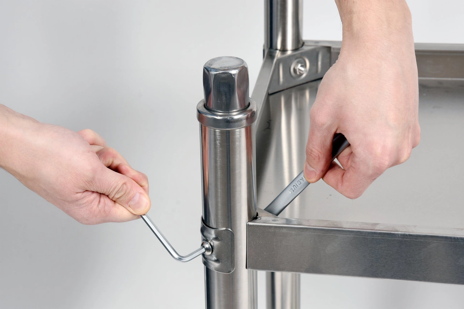 Spodná polica, pevne upevnená pod doskou, výrazne zvyšuje funkčnosť stola a umožňuje plné využitie pracovného priestoru. Jej nosnosť až 35 kg umožňuje uložiť príručné náradie a vybavenie, čo podporuje efektívnu organizáciu pracoviska. Nohy stola vyrobené z kruhových profilov sú výškovo nastaviteľné v rozsahu +/-15 mm, čo umožňuje vyrovnať stôl aj na nerovnom povrchu. Plastové podložky pripevnené k nohám chránia podlahu pred poškriabaním a zároveň sa starajú o estetiku okolia.