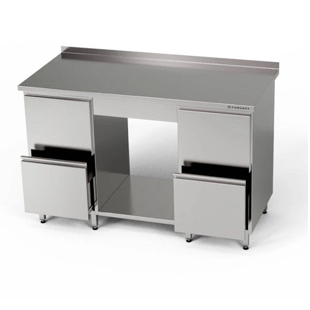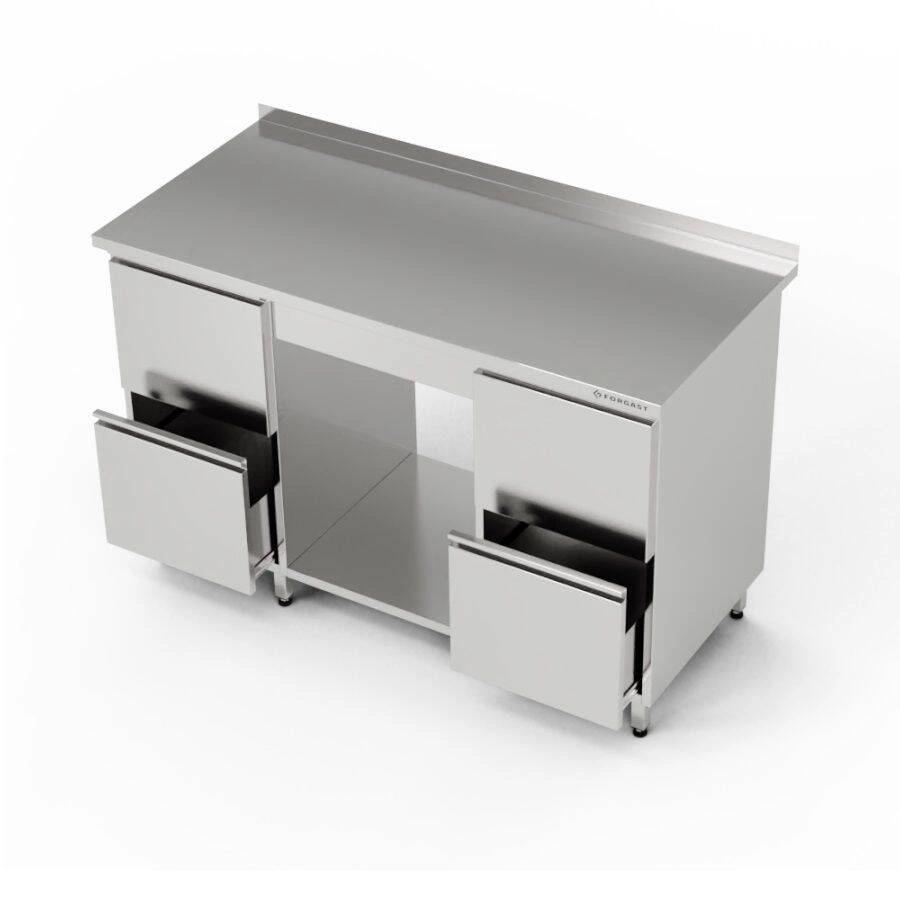 Pracovná stanica s rozmermi 240x60x85 cm s 2 blokmi po 2 zásuvky a pó³. Vyrobené z nehrdzavejúcej ocele J4. Pólka sa nachádza medzi blokmi zásuviek. Rozmery zásuvky v bloku s 2 zásuvkami: 44x46,5x44/18 cm.