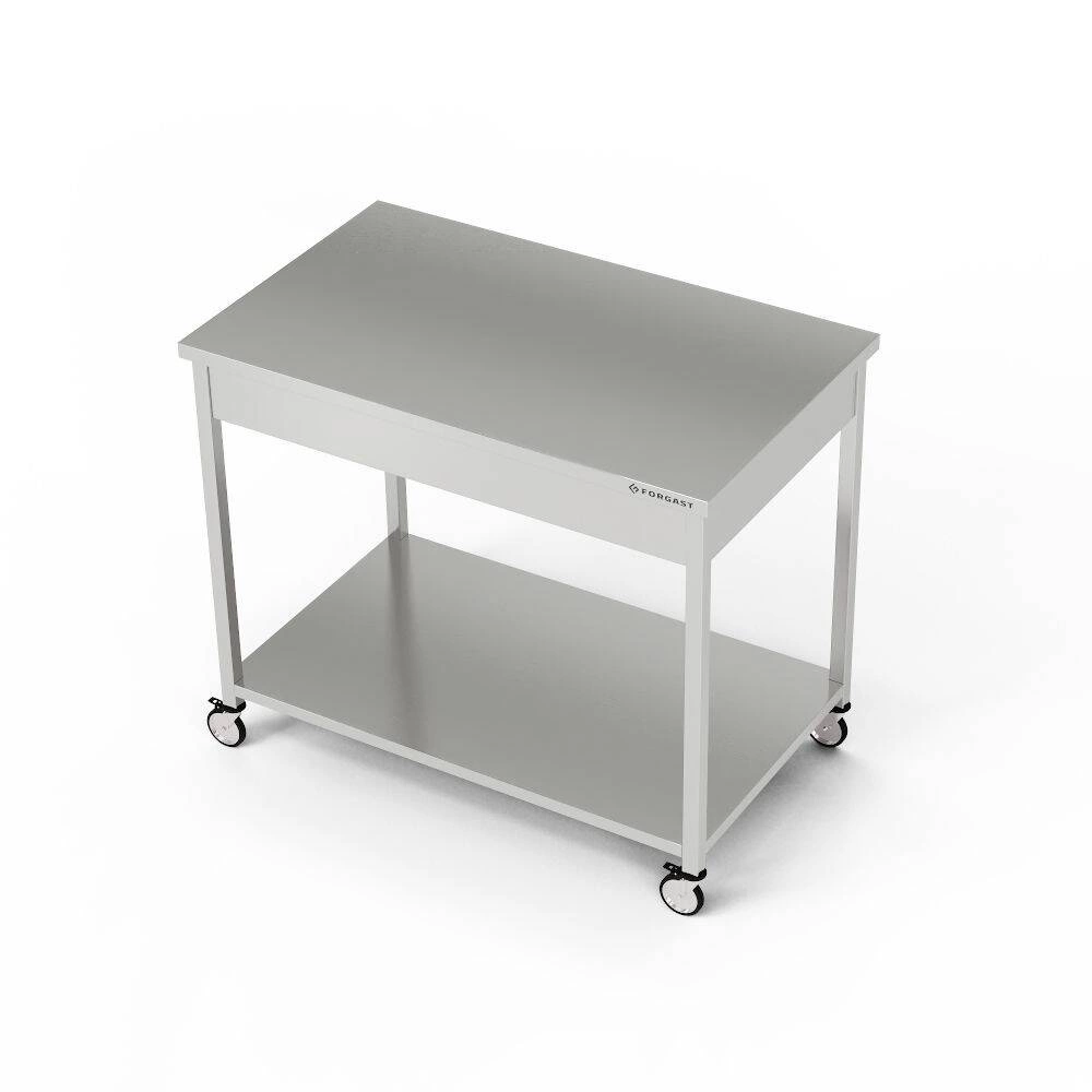Mobilná pracovná stanicaStôl so spodnou pólavicou s rozmermi 120x60x85 cm je vyrobený z nehrdzavejúcej ocele J4. Stôl je vybavený sadou 4 brzdených koliesok;