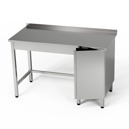 Pracovný stôlóso skrinkou s otváracími dvierkami, 120x70x85 cm, vyrobený z nehrdzavejúcej ocele J4. Skrinka s dĺžkou 40 cm a šírkou (hĺbkou) 60 cm môže byť umiestnená vpravo alebo vľavo. Vnútri skrinky je pólka.