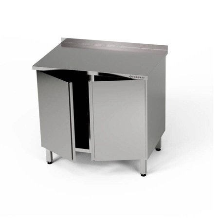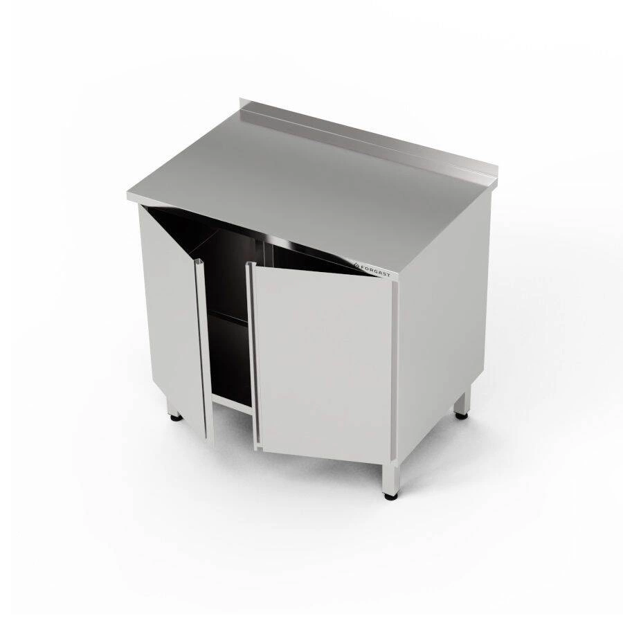 Pracovný stôl so skrinkou s otváracími dverami s rozmermi 140x60x85 cm z nehrdzavejúcej ocele J4. Súčasťou skrine je pólavica.
