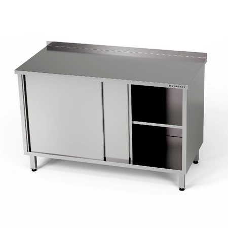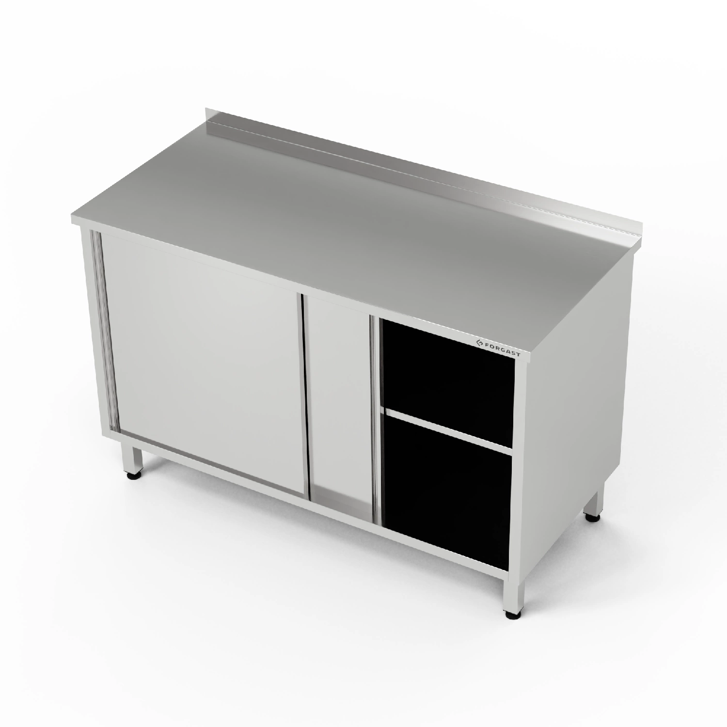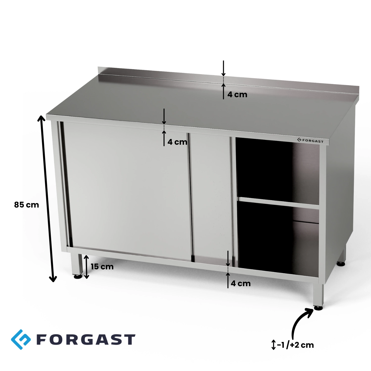Pracovná stanica s rozmermi 170x70x85 cm so skrinkou s posuvnými dverami z nehrdzavejúcej ocele J4. Vnútri skrine je półka.