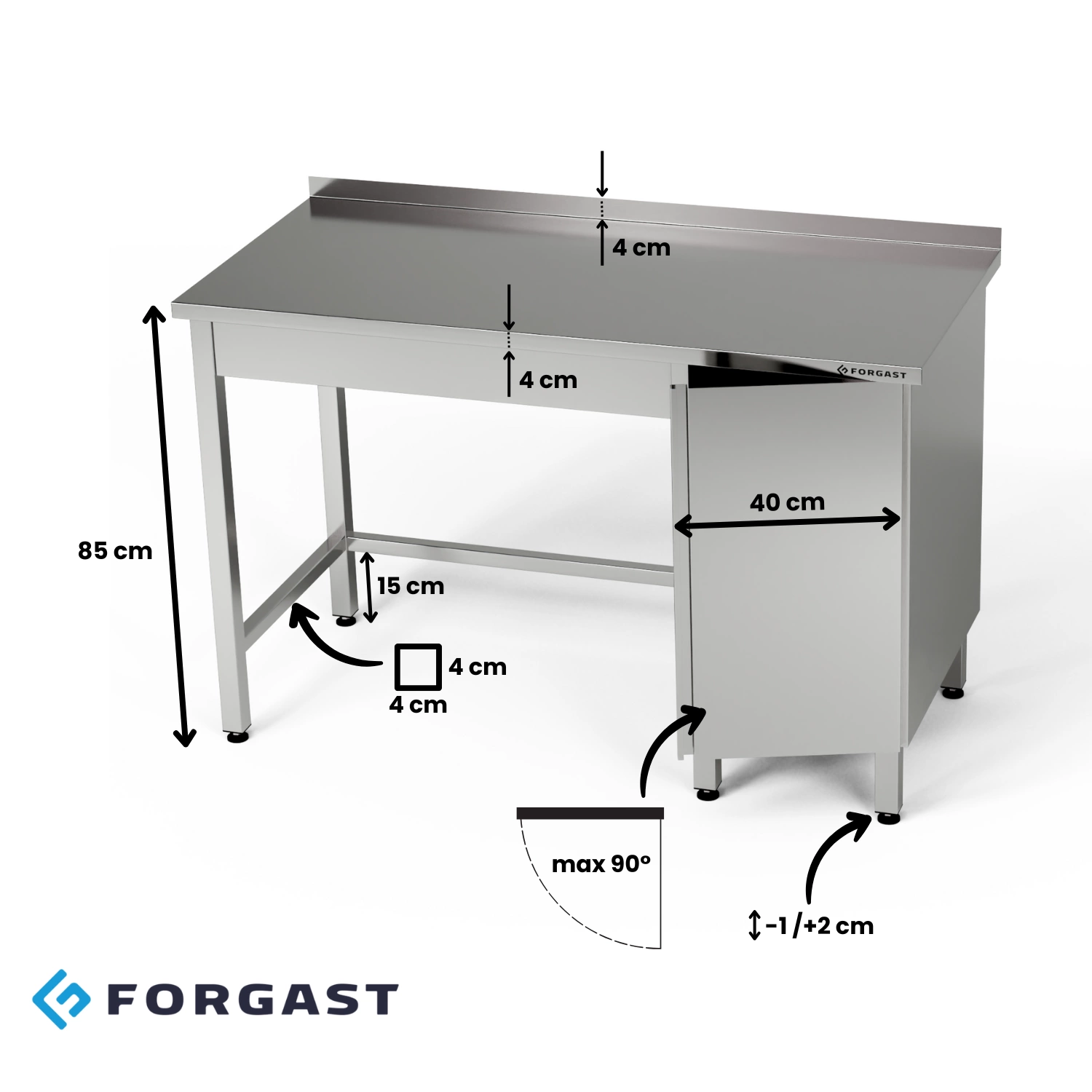 Pracovný stôlóso skrinkou s otváracími dvierkami, 210x70x85 cm, vyrobený z nehrdzavejúcej ocele J4. Skrinka s dĺžkou 40 cm a šírkou (hĺbkou) 60 cm môže byť umiestnená vpravo alebo vľavo. Vnútri skrinky je pólka.