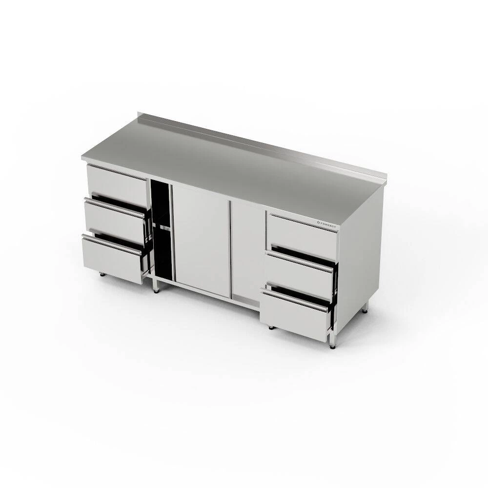 Pracovná stanica 160x70x85 cm s 2 blokmi po 3 zásuvkách a skrinkou s posuvnými dverami. Vo vnútri skrine je półka. Vyrobená z nehrdzavejúcej ocele J4. Skrinka v strede, medzi blokmi zásuviek. Rozmery zásuvky v bloku 3 zásuviek: 46,5x21,5x44/13 cm.