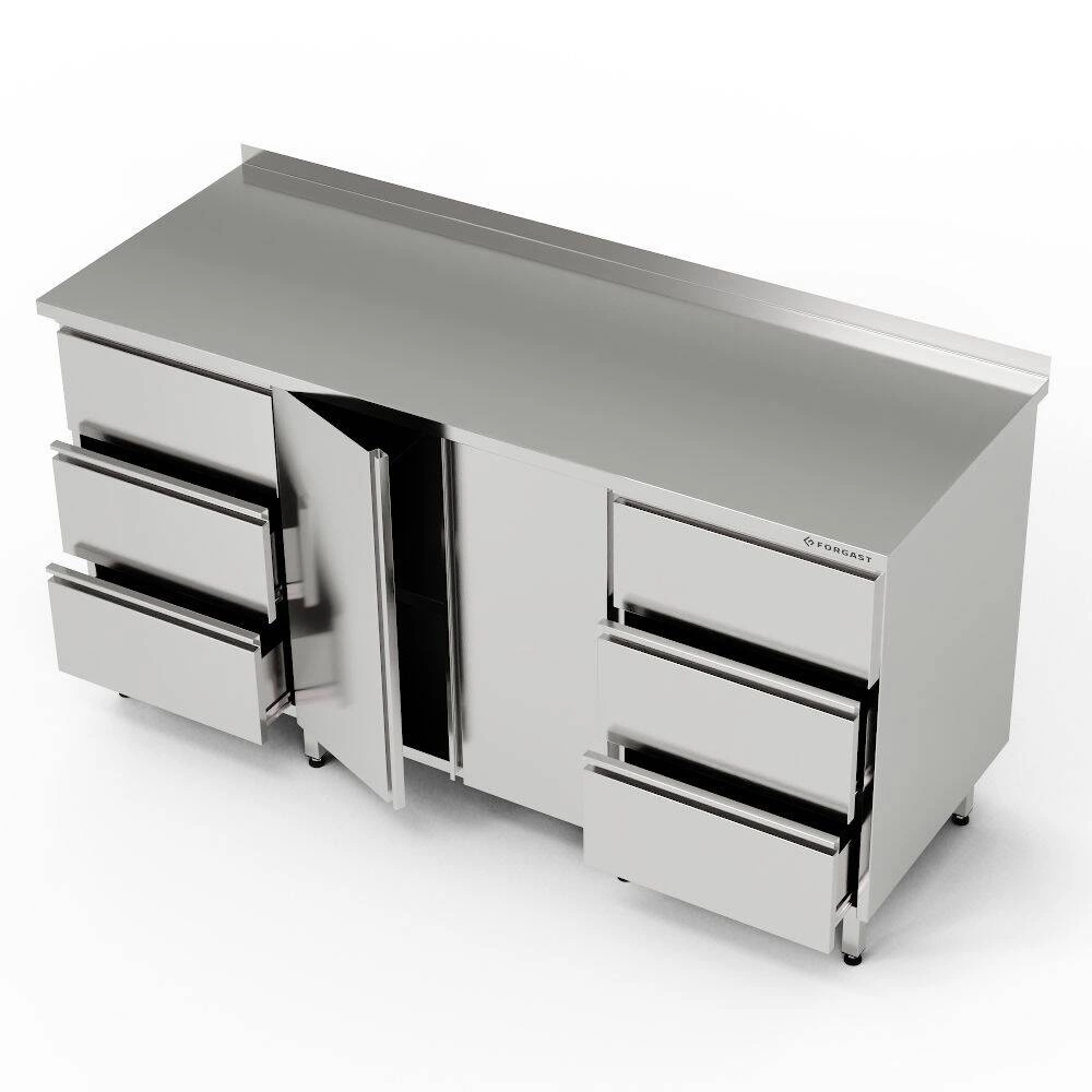 Pracovná stanica s rozmermi 220x70x85 cm s 2 blokmi po 3 zásuvky a skrinkou s otváracími dvierkami. Vnútri skrinky je półka. Vyrobená z nehrdzavejúcej ocele J4. Skrinka v strede, medzi blokom zásuviek. Rozmery zásuviek v bloku s 3 zásuvkami: 46,5x21,5x44/13 cm.