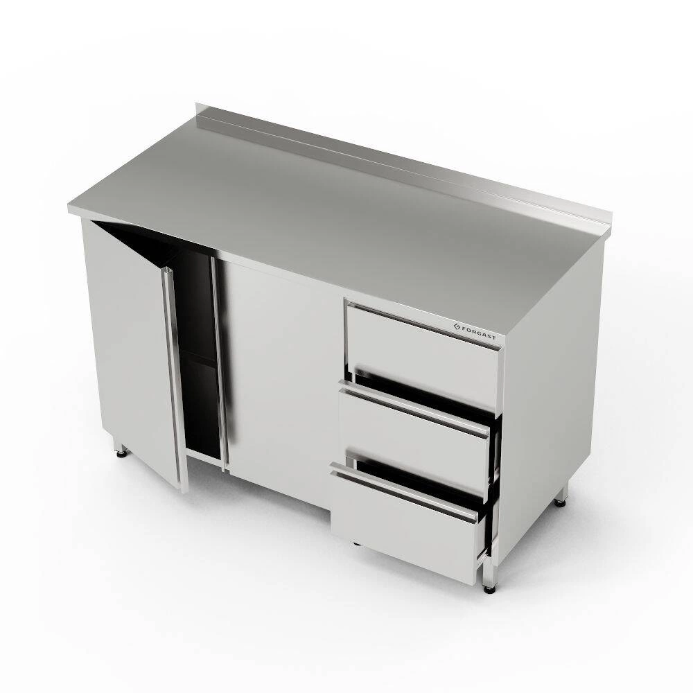 Pracovná stanica s rozmermi 180x60x85 cm s blokom 3 zásuviek a skrinkou s otváracími dvierkami. Vo vnútri skrine je półka. Vyrobená z nehrdzavejúcej ocele J4. Skrinka môže byť umiestnená na pravej alebo ľavej strane. Rozmery zásuvkového bloku s 3 zásuvkami: 46,5x21,5x44/13 cm.