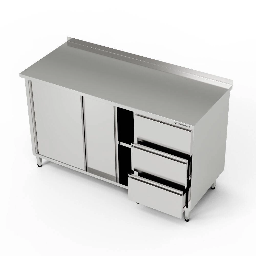 Pracovná stanica s rozmermi 180x70x85 cm s blokom 3 zásuviek a skrinkou s posuvnými dverami. Vo vnútri skrinky je pólavica. Vyrobená z nehrdzavejúcej ocele J4. Skrinka môže byť umiestnená na ľavej alebo pravej strane. Rozmery zásuviek bloku s 3 zásuvkami: 46,5x21,5x44/13 cm.