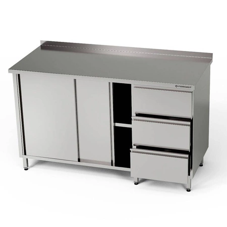 Pracovný stôl z nehrdzavejúcej ocele so skrinkou a 3-zásuvkovým blokom 220x60x85 cm | FORGAST