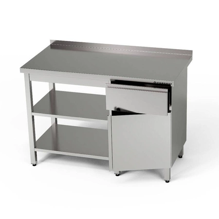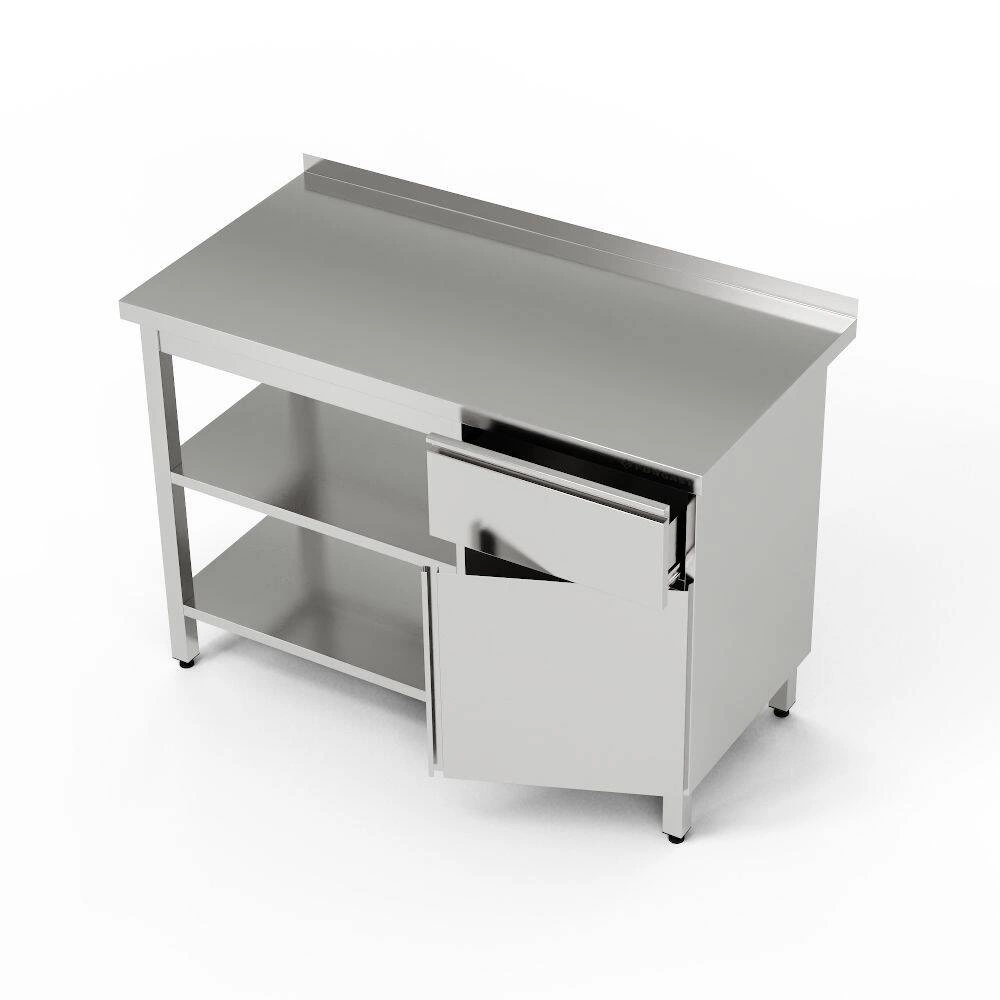 Pracovný stôl s rozmermi 100x60x85 cm so skrinkou s otváracími dvierkami, zásuvkou a 2 skrinkami. Skriňa so zásuvkou dlhou 40 cm a širokou 60 cm (hlboká) umiestnená na pravej strane. Vo vnútri skrinky je półka. Na ľavej strane dve skrinky. Stół z nehrdzavejúcej ocele J4.