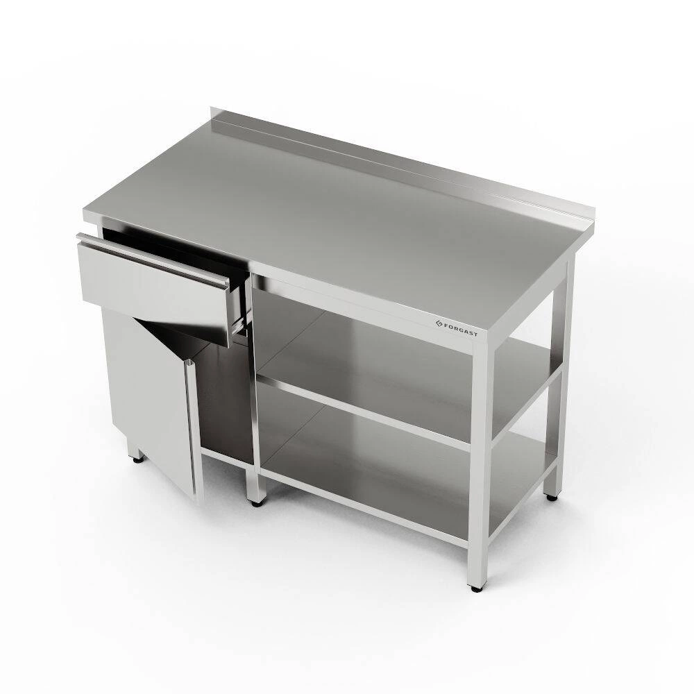 Pracovný stôl s rozmermi 130x60x85 cm so skrinkou s otváracími dvierkami, zásuvkou a 2 skrinkami. Skriňa so zásuvkou dlhou 40 cm a širokou 60 cm (hlboká) umiestnená na ľavej strane. Vo vnútri skrinky je półka. Na pravej strane dve skrinky. Stół z nehrdzavejúcej ocele J4.