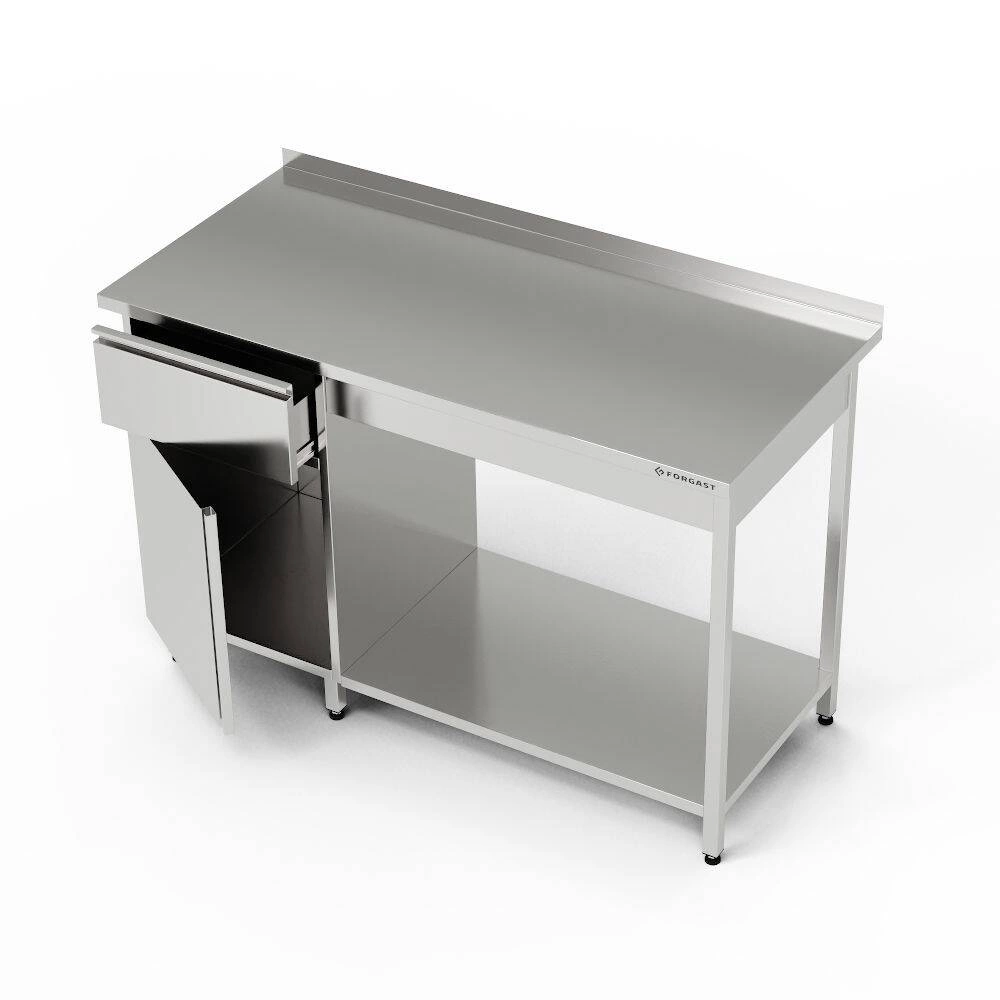Pracovný stôl s rozmermi 100x60x85 cm so skrinkou s otváracími dvierkami, zásuvkou a pó³. Skriňa so zásuvkou dlhou 40 cm a širokou 60 cm (hlboká) umiestnená na ľavej strane. Vo vnútri skrinky je półka. Na pravej strane stola spodná skrinka. Stôl je vyrobený z nehrdzavejúcej ocele J4.