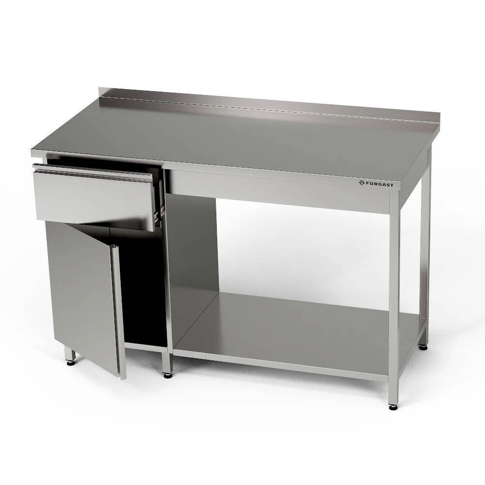 Pracovný stôl s rozmermi 110x60x85 cm so skrinkou s otváracími dvierkami, zásuvkou a pó³. Skriňa so zásuvkou dlhou 40 cm a širokou 60 cm (hlboká) umiestnená na ľavej strane. Vo vnútri skrinky je półka. Na pravej strane stola spodná skrinka. Stôl je vyrobený z nehrdzavejúcej ocele J4.