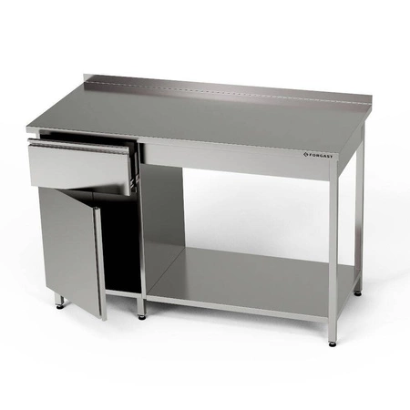 Pracovný stôl 190x70x85 cm so skrinkou s otváracími dvierkami, zásuvkou a pó³. Skriňa so zásuvkou dlhou 40 cm a širokou 60 cm (hlboká) umiestnená na ľavej strane. Vo vnútri skrinky je półka. Na pravej strane stola spodná skrinka. Stôl je vyrobený z nehrdzavejúcej ocele J4.