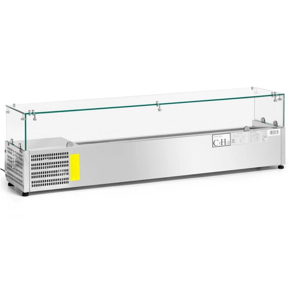 - Rozmery (dĺžka x šírka x výška): 140 x 33,5 x 44 cm – kompaktné rozmery umožňujú umiestnenie nadstavca na rôzne typy chladiacich stolov.