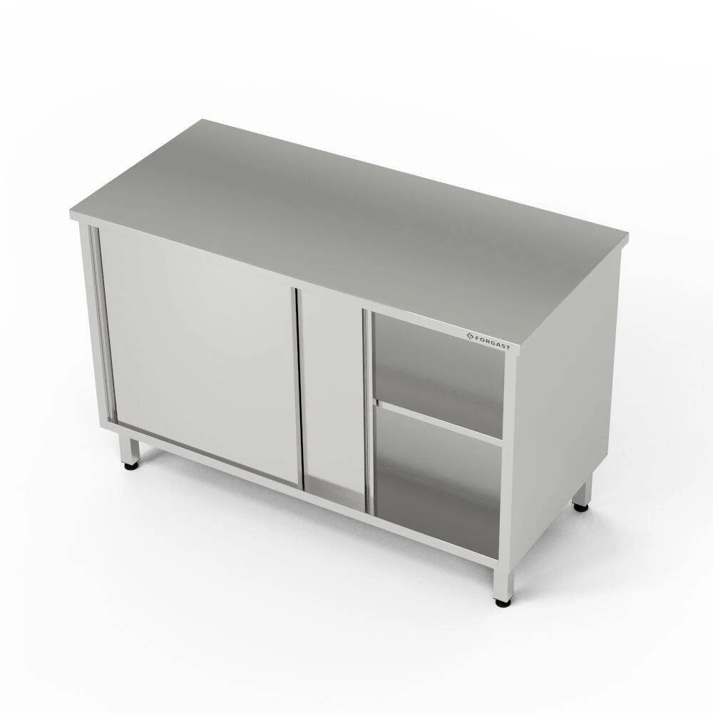 Pracovný stôl s rozmermi 150x60x85 cm so skrinkou s posuvnými dverami z nehrdzavejúcej ocele J4. Vnútri skrine je pó³ka. Skriňa má posuvné dvere na oboch stranách.