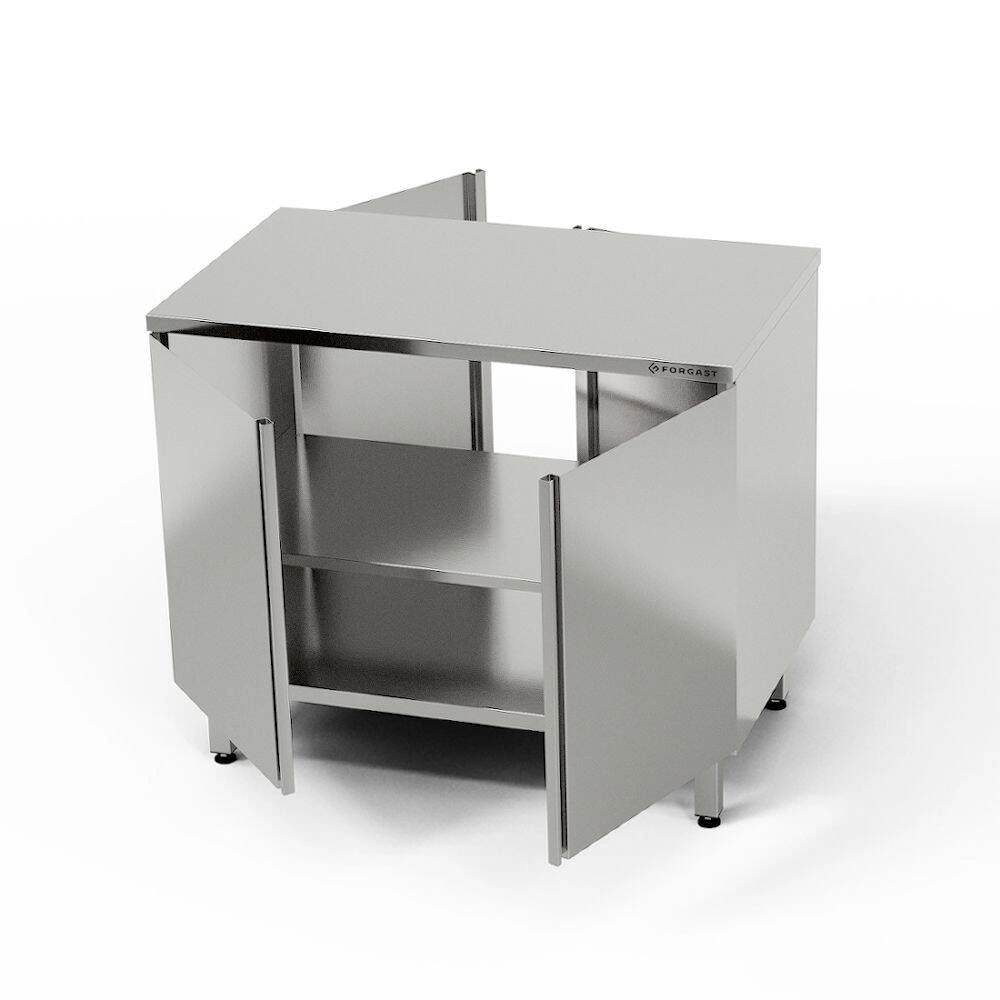 Priechodný pracovný stôl s rozmermi 120x60x85 cm z nehrdzavejúcej ocele J4. Stôl má výklopné dvierka a skrinku, ktorá drží skrinku. Stredový stôl je bez ráfikov.