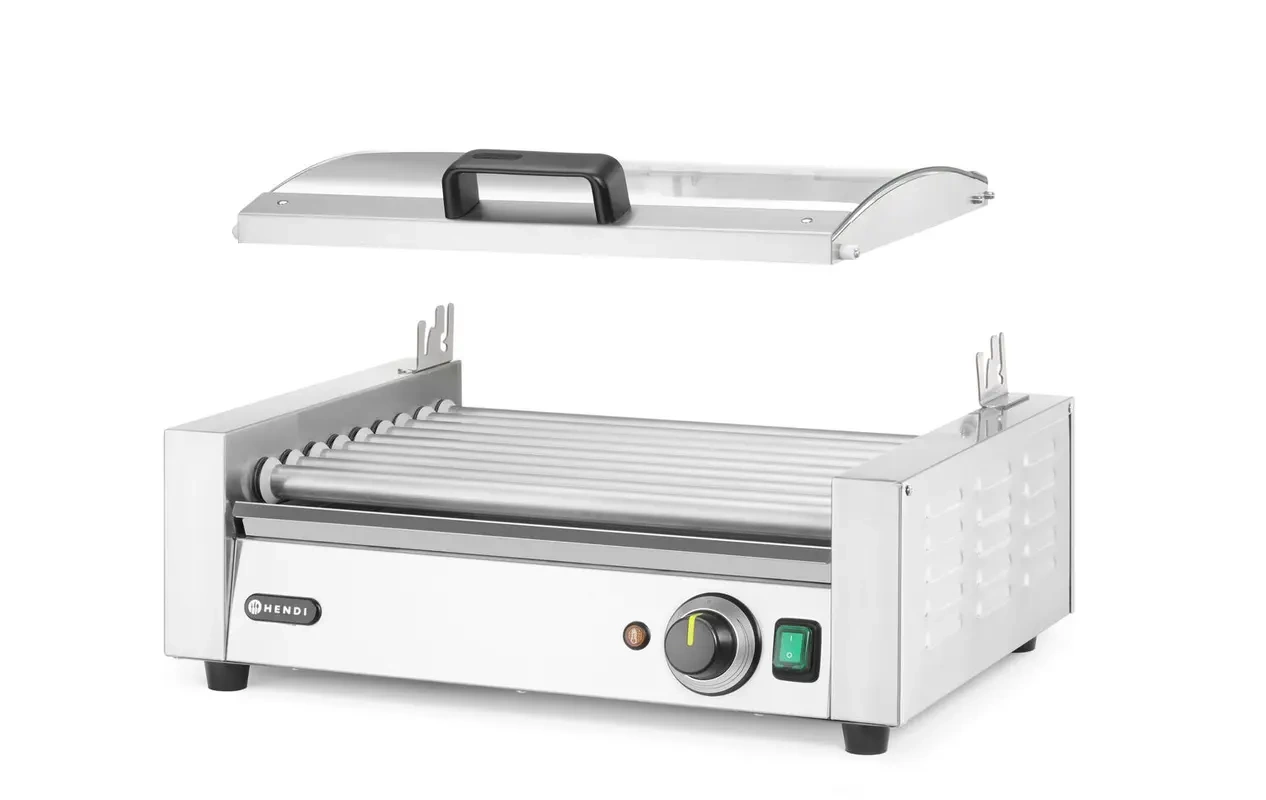 Rolkova ohrievačka na párky HENDI 268643 je profesionálne zariadenie určené na rýchle a rovnomerné ohrievanie párkov v gastronómii. Vybavená deviatimi valčekmi z nehrdzavejúcej ocele a energeticky úsporným, tvrdeným skleneným poklopom, zaručuje efektívnu obsluhu a udržiavanie optimálnej teploty. Ideálna vo fast food baroch, food truckoch a počas veľkých vonkajších akcií.