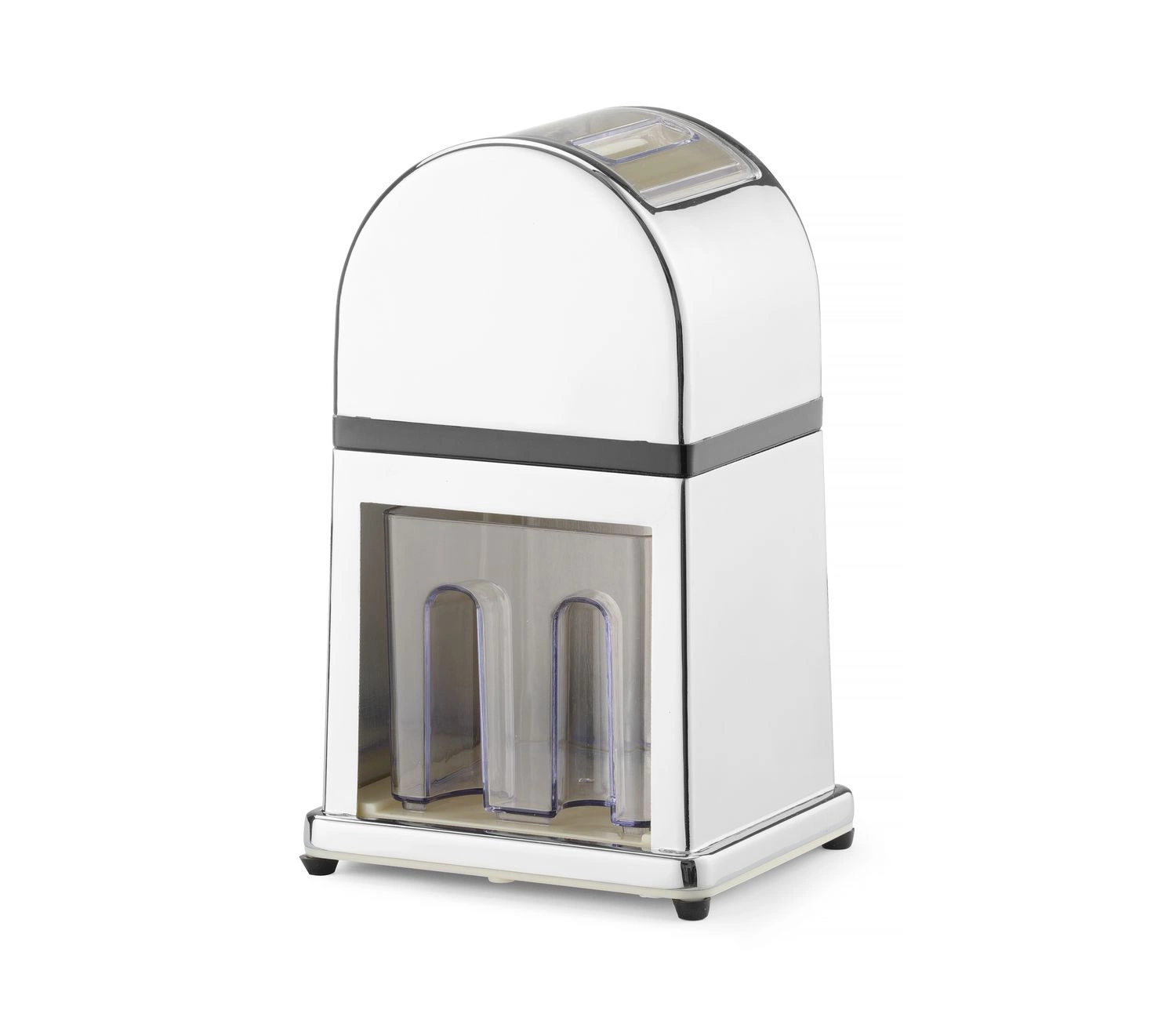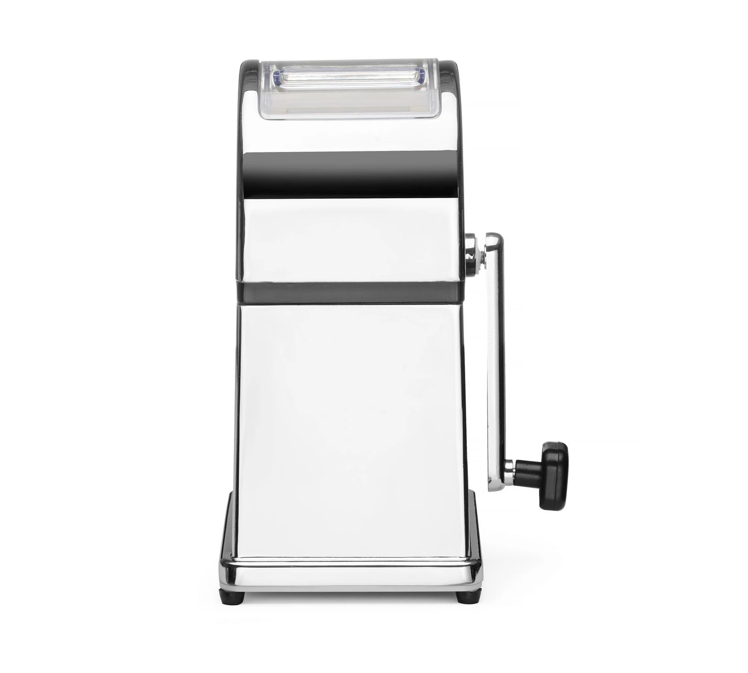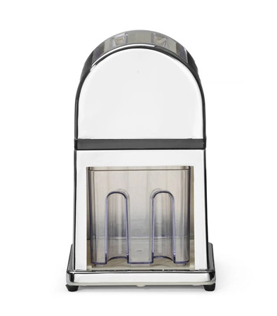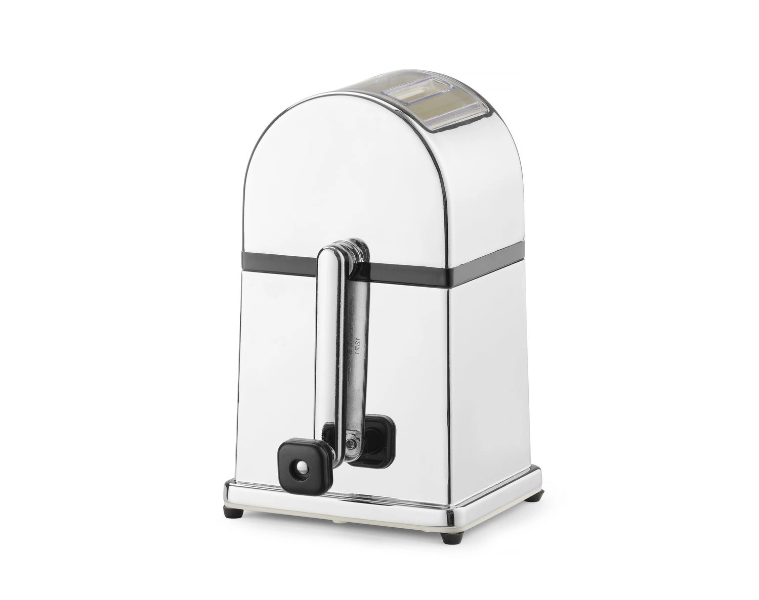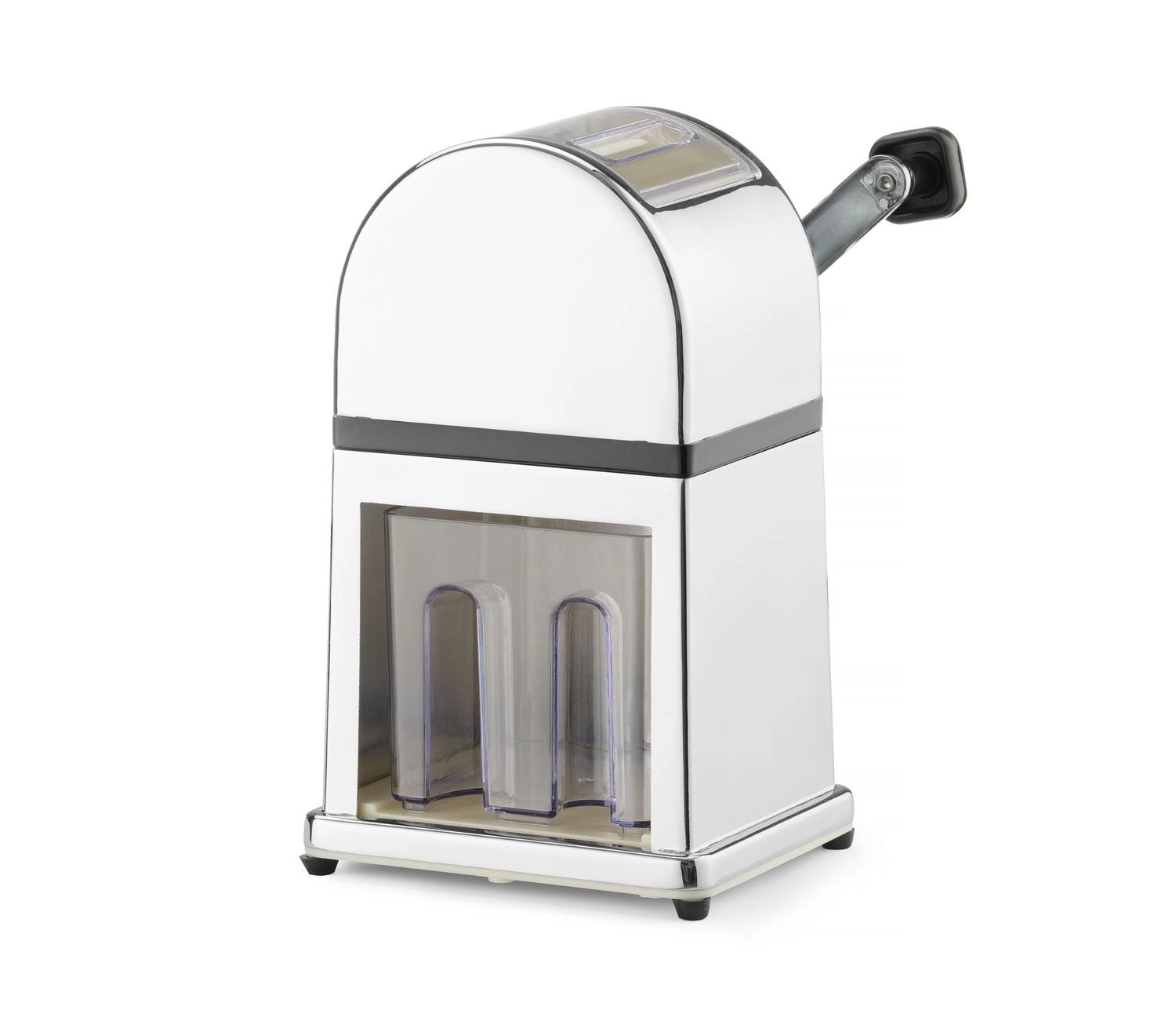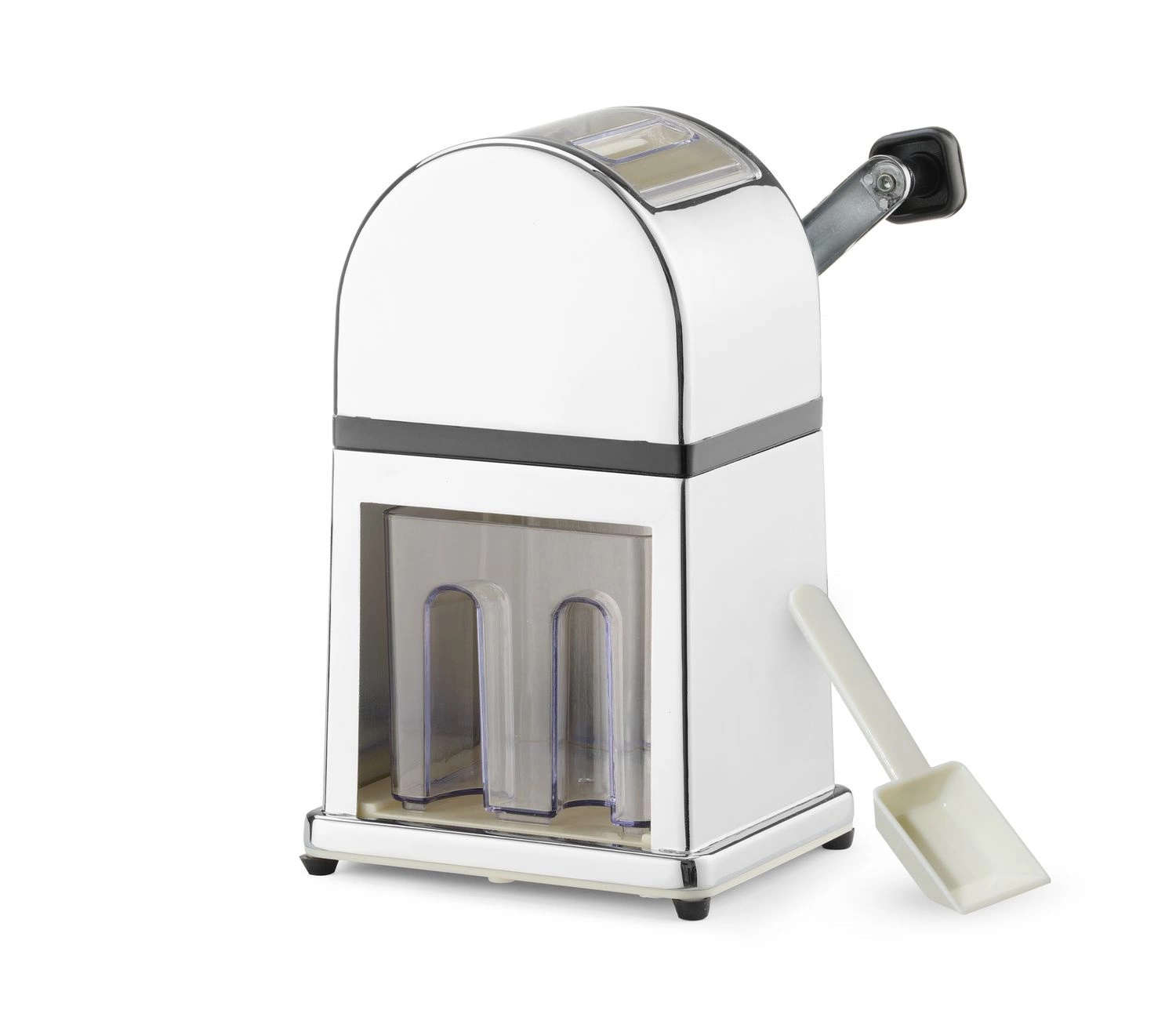 Ručný drvič ľadu v pochrómovanom puzdre zo zinkovej zliatiny. Nádoba a naberačka z plastu a nón z nehrdzavejúcej ocele.