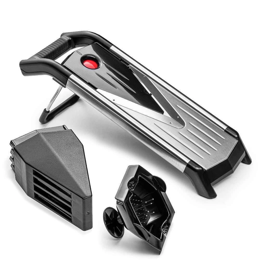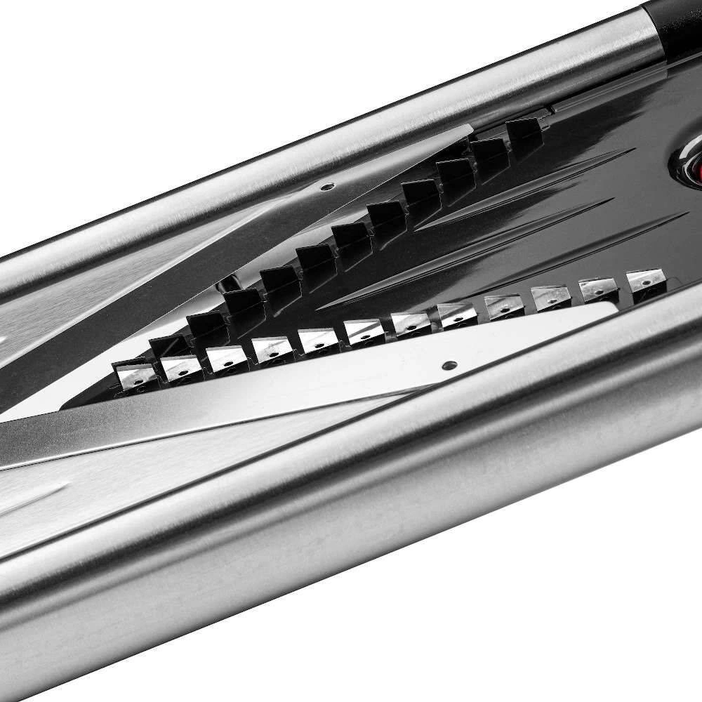 • Päť vymeniteľných čepelí – sada umožňuje krájanie na plátky rôznych hrúbok (1,5 mm, 2,5 mm, 3,5 mm) a na hranolky Julienne (3,5 x 3,5 mm a 7 x 7 mm). To umožňuje pripraviť rôzne jedlá a efektné zeleninové dekorácie, čo oceníte v reštaurácii aj v domácej kuchyni.