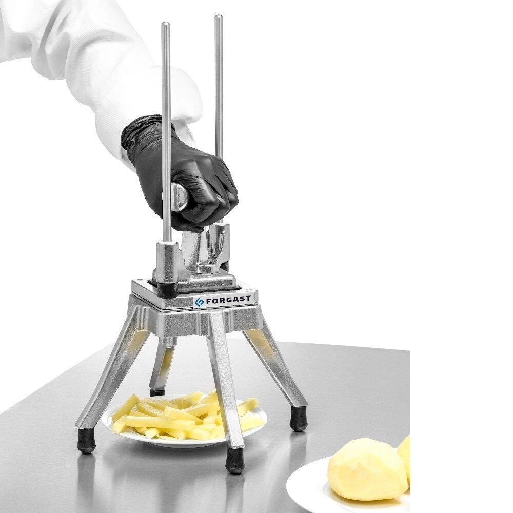 Krájač FORGAST FG10007 je ručné zariadenie, ktoré nevyžaduje pripojenie na elektrinu, vďaka čomu ho môžete používať v profesionálnej kuchyni aj v exteriéri počas cateringových akcií. Jeho kompaktné rozmery – 20 x 20 x 47 cm – umožňujú pohodlné umiestnenie aj na malých pracoviskách a zároveň umožňujú efektívnu prípravu veľkého množstva porcií v krátkom čase. Skvele sa hodí na prípravu hranoliek zo zemiakov, ako aj na krájanie inej zeleniny či ovocia na kocky, napríklad do šalátov, polievok či predjedál.