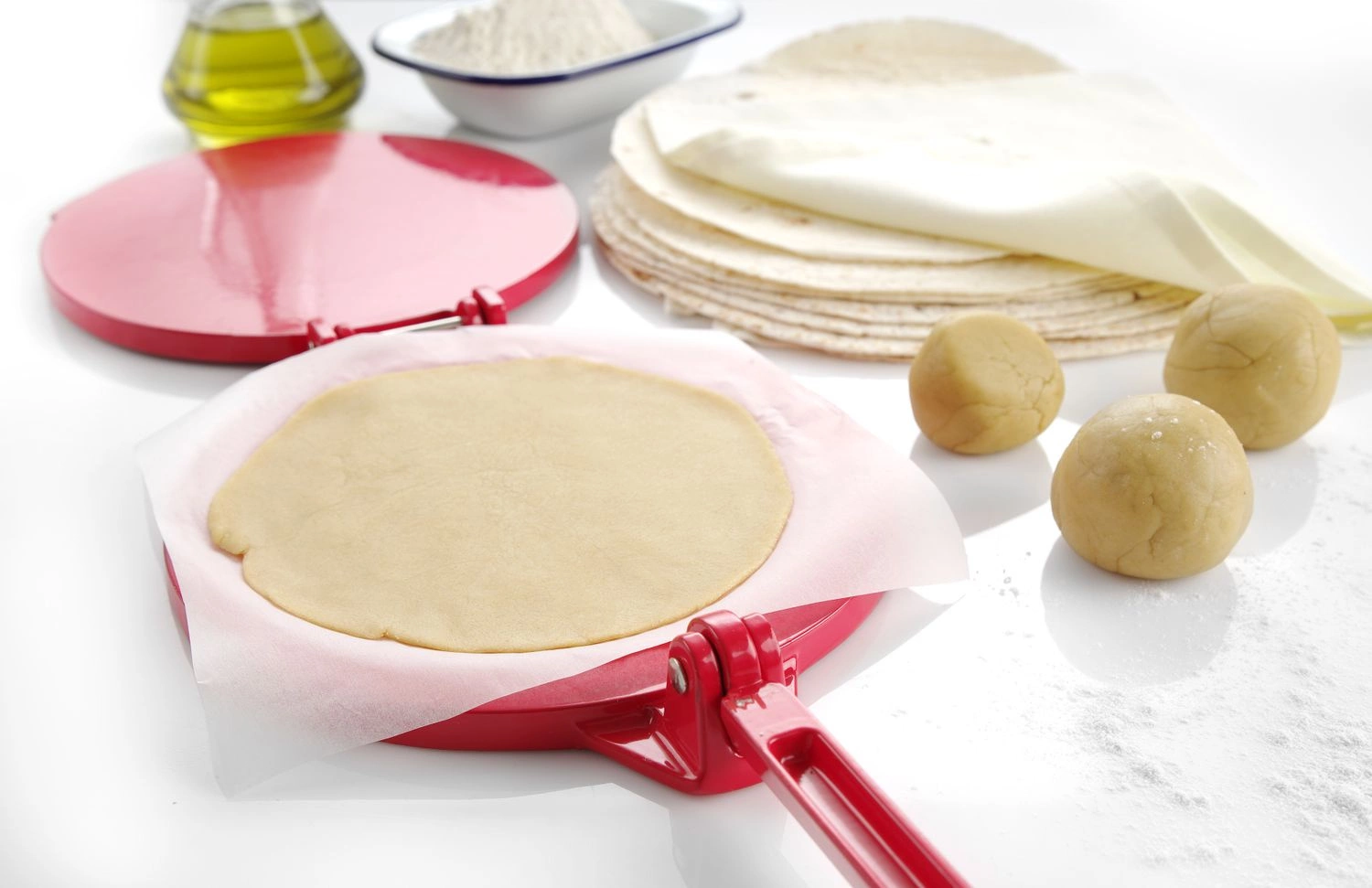 Ručný lis na tortilly. Maximálny priemer tortilly 20 cm. Vyrobené z hliníkovej zliatiny s práškovou farbou v červenej farbe.