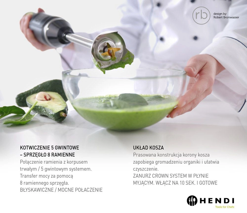 Ručný mixér s maximálnymi otáčkami 16 000 ot/min. Puzdro je vyrobené z ABS plastu, rameno z nehrdzavejúcej ocele. Skrížený nôž z nehrdzavejúcej ocele s titánom. Výkonný 250 W motor. Mixér má elektronický ovládací panel s LED displejom - 6 rýchlostí. Vhodný pre hrnce a panvice od 1 do 4 litrovów.