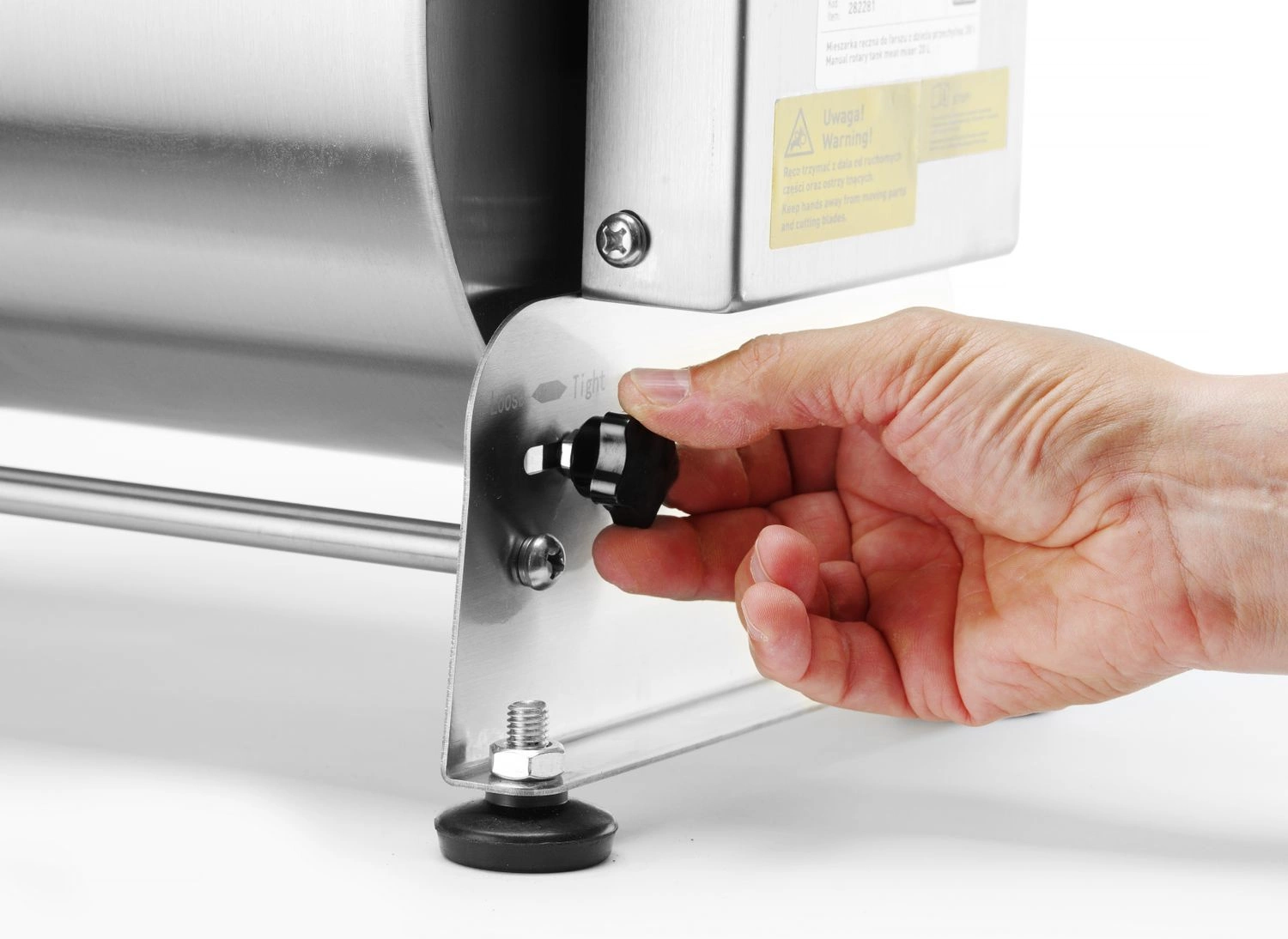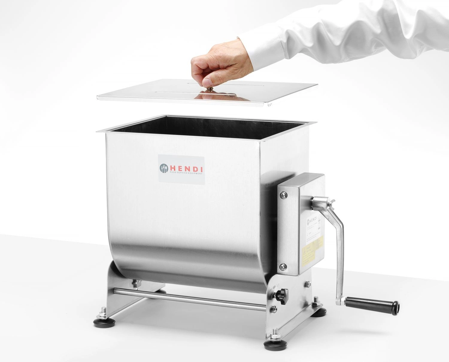 Ručný mixér na mäso s objemom 20 litrov. . Je vyrobený z nehrdzavejúcej ocele AISI 304 a je ideálny na výrobu klobás v malom rozsahu. Úplná demontáž misy a miešadla umožňuje dôkladné a rýchle čistenie. Rukoväť je vyrobená z liateho hliníka. Sklápacia misa s bezpečnostnou poistkou uľahčuje vyberanie hotovej plnky.  3 otočenia kľuky rónujú jedno otočenie miešačky v mise.