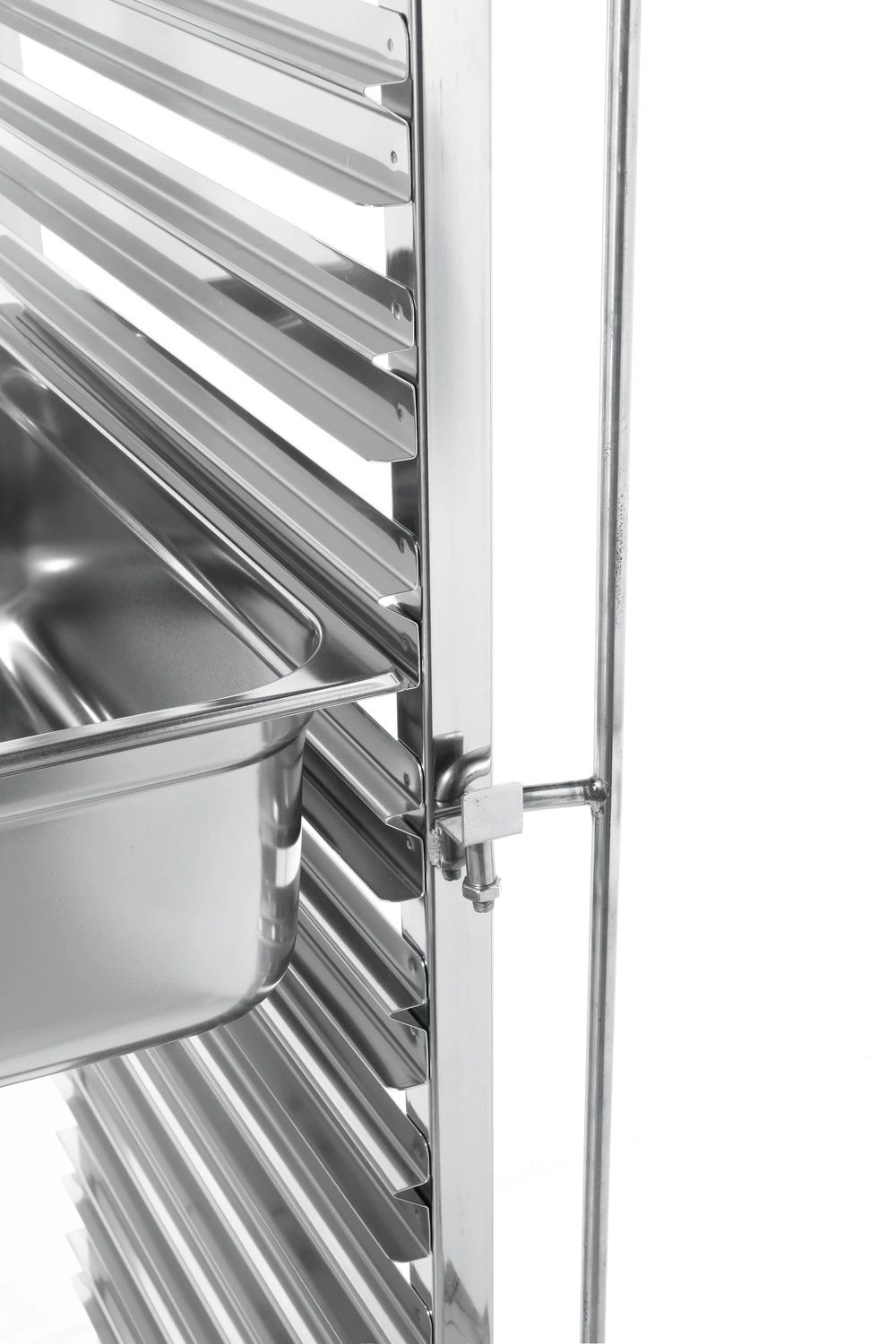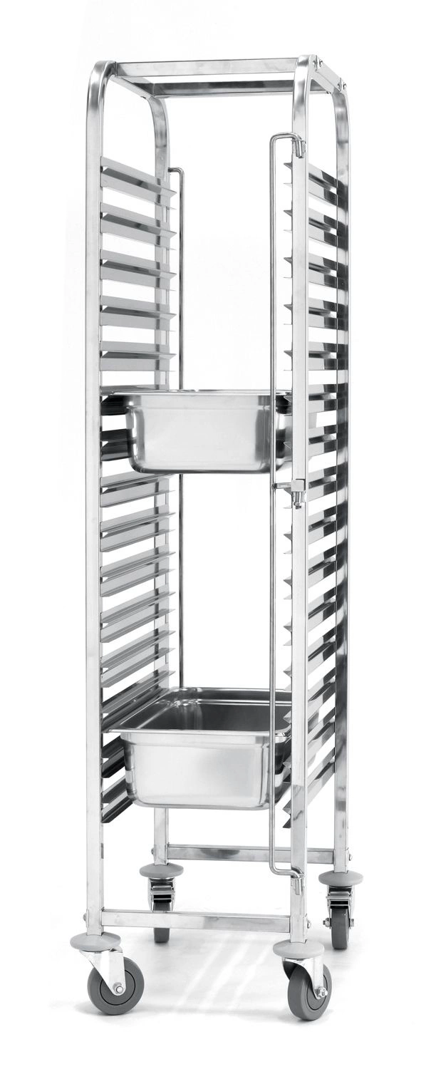 Wózek z chrómovej ocele na prepravu zásobníkov a kontajnerov GN. Vozík si vyžaduje vlastnú montáž. 4 otočné kolieska (2 s brzdou). GN kontajnery sú chránené proti vypadnutiu na oboch stranách. Kapacita 15 GN 1/1.