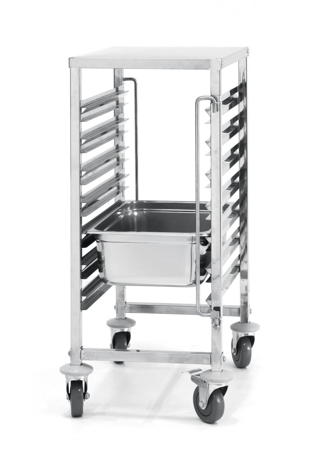 Wózek z chrómovej ocele na prepravu zásobníkov a kontajnerov GN. Vozík si vyžaduje vlastnú montáž. 4 otočné kolieska (2 s brzdou). Na vrchnej časti vozíka je pracovná plocha. GN kontajnery zabezpečené na oboch stranách proti vypadnutiu. Kapacita 7 GN 1/1.
