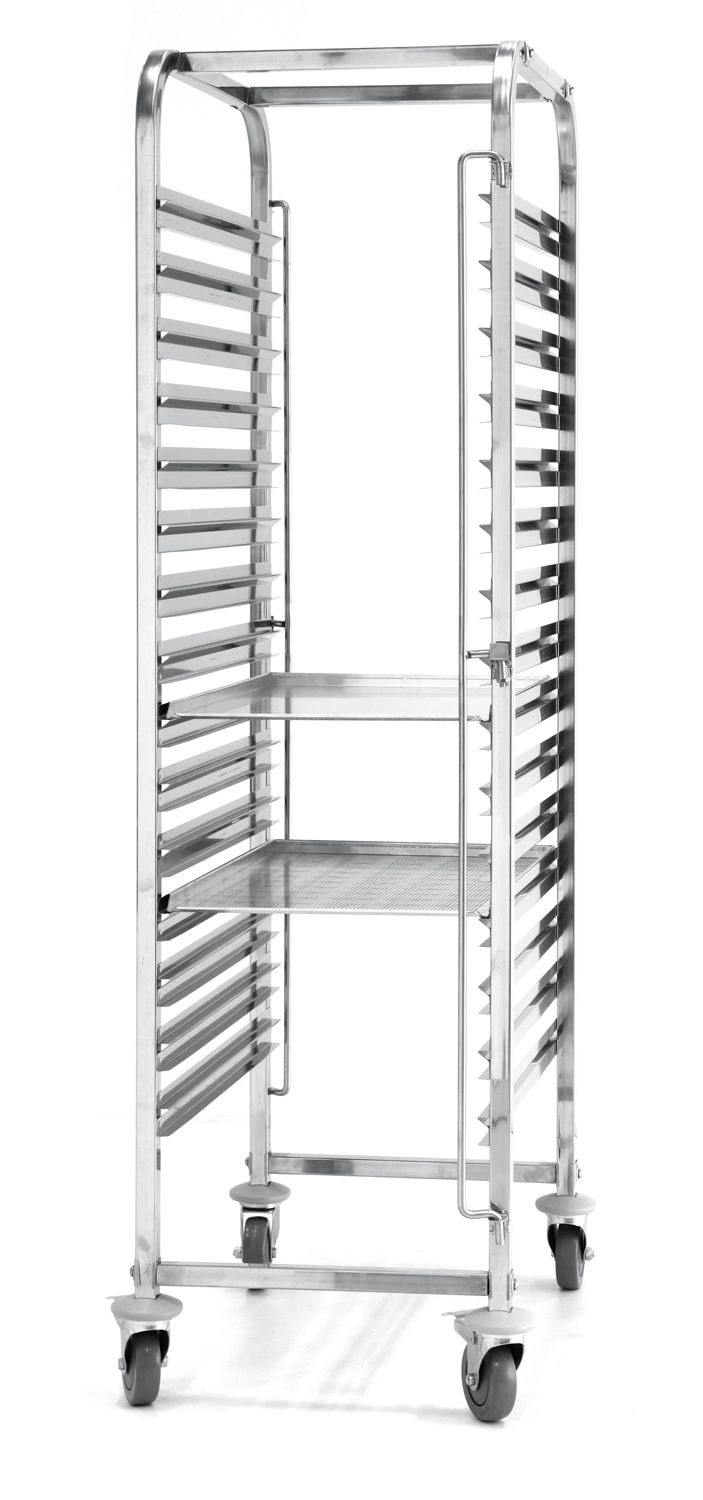 Wózek z nehrdzavejúcej ocele na prepravu plechov na pečenie. Vozík si vyžaduje vlastnú montáž. 4 otočné kolieska (vrátane 2 s brzdou). chránené proti vypadnutiu na oboch stranách. Vzdialenosť medzi jednotlivými úrovňami je 8 cm. Kapacita wózky 15 plechov na pečenie s rozmermi 60x40 cm.
