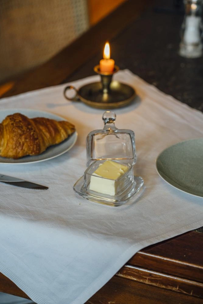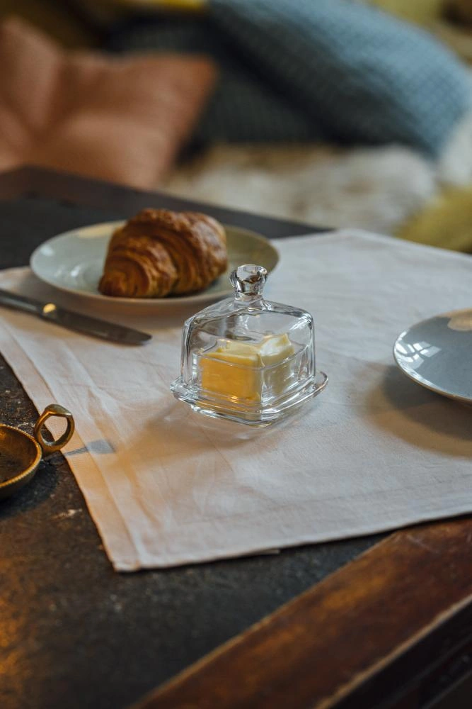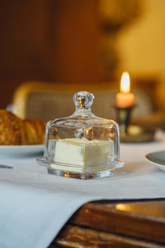 Sklenená maselnička s pokrievkou spája eleganciu a funkčnosť, zaručuje pohodlné používanie a estetický vzhľad na každom stole. Odolné sklo a praktický dizajn robia z tejto maselničky výbornú voľbu na každodenné jedlá aj špeciálne príležitosti. Je to produkt, ktorý podčiarkne dôraz na detaily a uľahčí servírovanie masla v každej kuchyni.