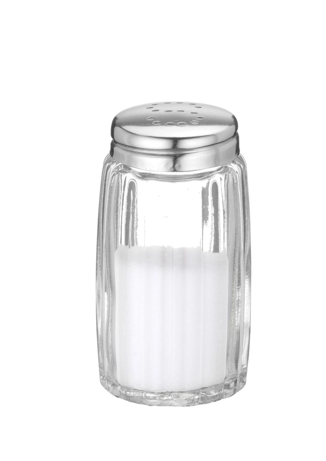 Sklenená soľnička s vekom z nehrdzavejúcej ocele.