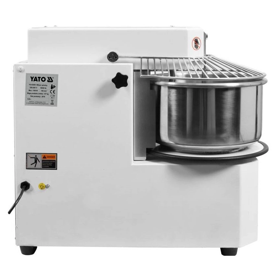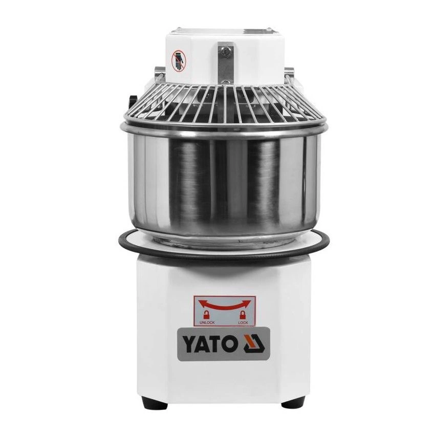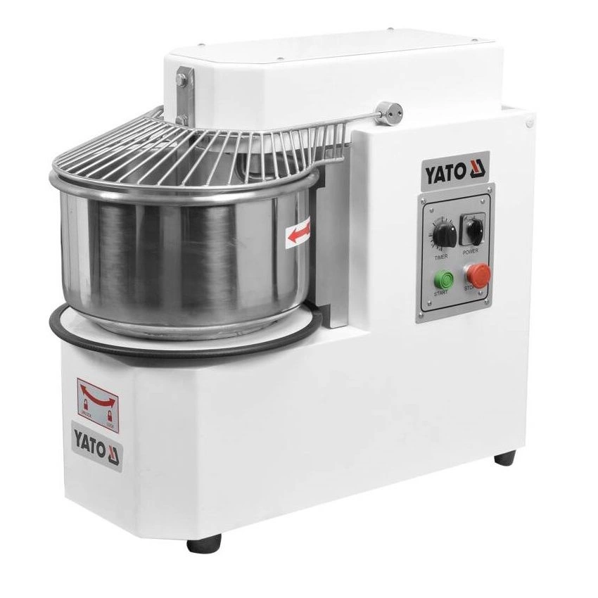 Špirálový mixér Značka YATO s pevnou miskou s objemom 20 litrov a priemerom 36 cm s naklápacou hlavou. Spotrebič je ideálny na miesenie ťažkých druhov cesta, ako je pizza, chlieb, knedle, šišky. Tento mixér, ktorý je navrhnutý s ohľadom na funkčnosť a bezpečnosť, splní očakávania profesionálnych kuchárov. Mixér vyrobený z hliníka a ocele a natretý bielou farbou nielenže vyzerá esteticky, ale sa aj ľahko udržiava v čistote. Misa a ďalšie príslušenstvo vyrobené z nehrdzavejúcej ocele sú bezpečné pre styk s potravinami. Maximálne zaťaženie cesta je 8 kg