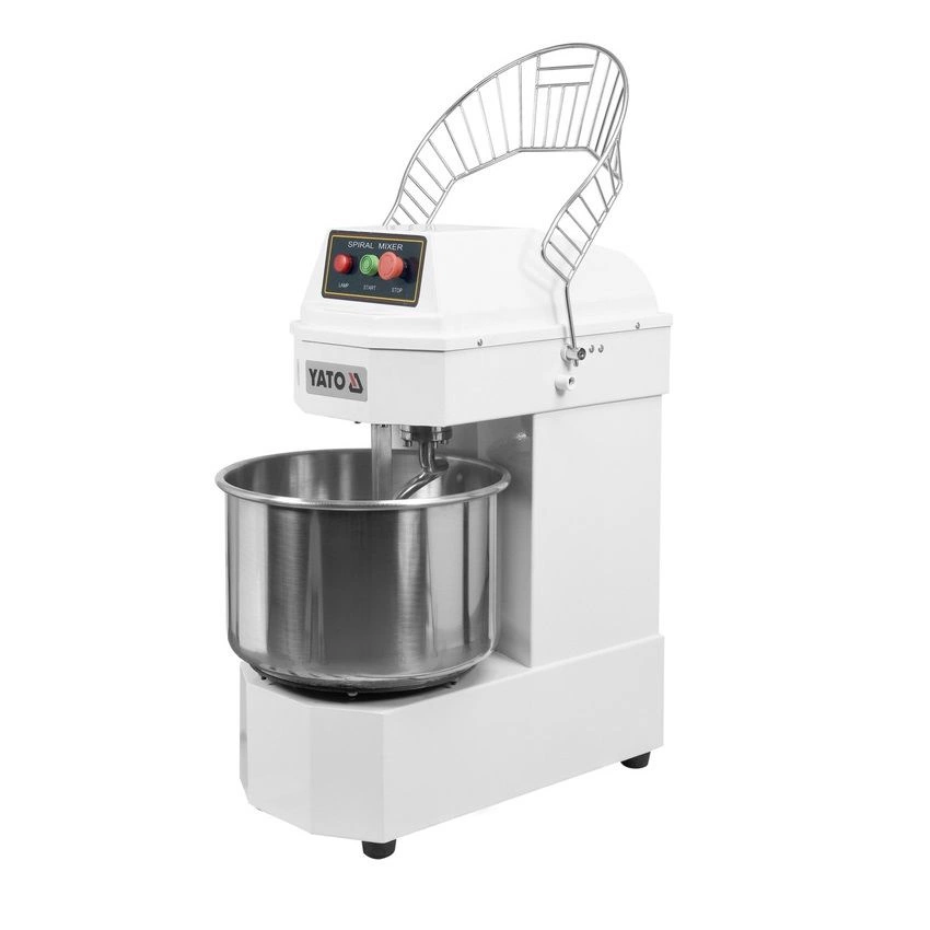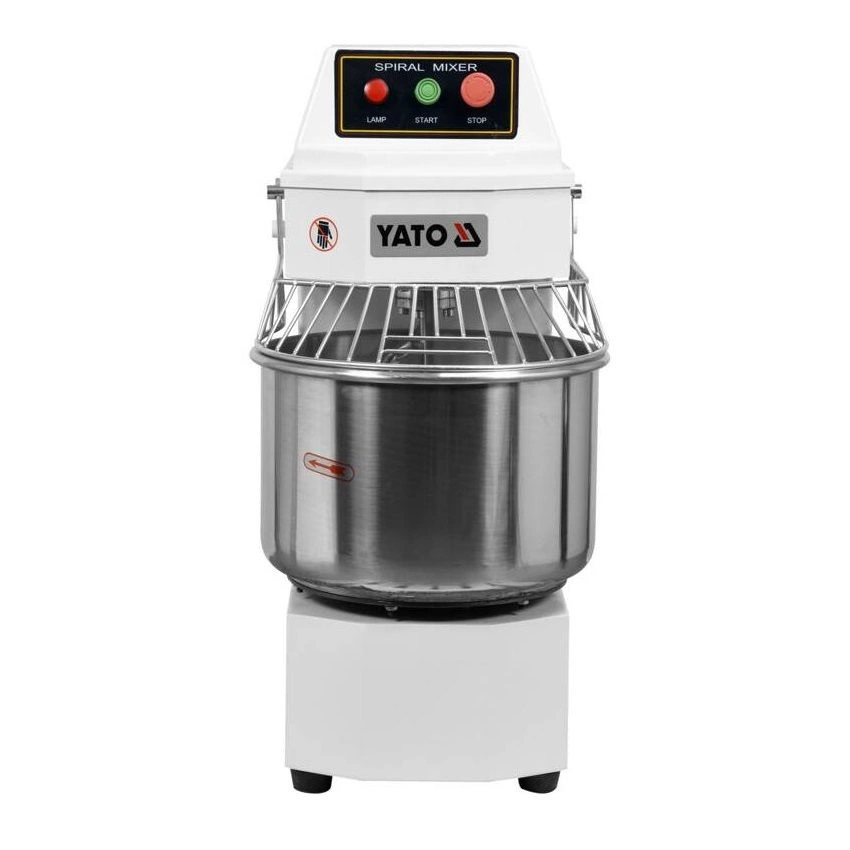 Špirálový mixér Značka YATO s pevnou misou s objemom 30 litrov a priemerom 40 cm s naklápacou hlavou. Spotrebič je ideálny na miesenie ťažkých druhov cesta, ako je pizza, chlieb, knedle, šišky. Tento mixér, ktorý je navrhnutý s ohľadom na funkčnosť a bezpečnosť, splní očakávania profesionálnych kuchárov. Mixér vyrobený z hliníka a ocele a natretý bielou farbou nielenže vyzerá esteticky, ale sa aj ľahko udržiava v čistote. Misa a ďalšie príslušenstvo vyrobené z nehrdzavejúcej ocele sú bezpečné pre styk s potravinami. Maximálna náplň cesta je 12,5 kg. Rozmery jednotky sú 89x73x43 cm.