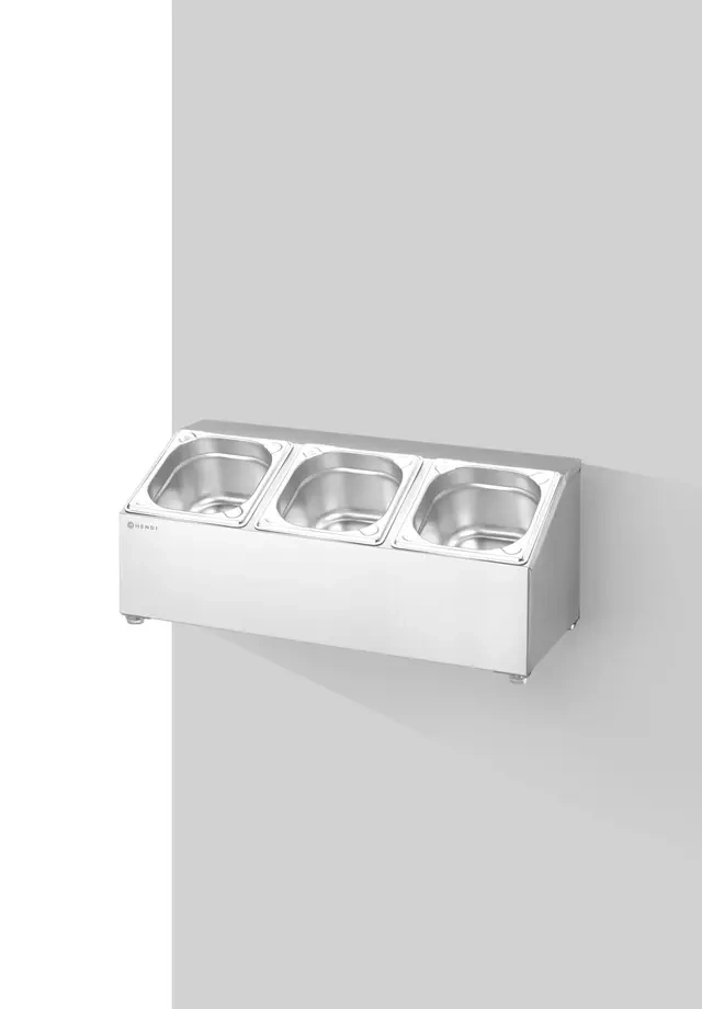 Stojan na 3 nádoby GN 1/6 HENDI 820032 je praktické riešenie pre profesionálne kuchyne, reštaurácie a gastronomické prevádzky, kde je dôležitá organizácia priestoru a jednoduchý prístup k GN nádobám. Produkt sa vyznačuje pevnou konštrukciou z nehrdzavejúcej ocele a možnosťou montáže na stenu, čo z neho robí univerzálny a pohodlný doplnok na každodenné používanie.