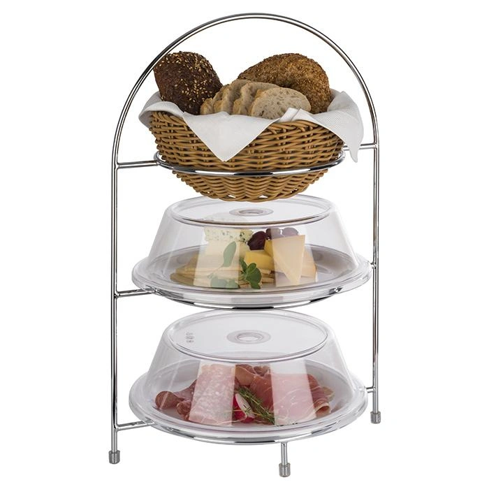 Stojan na servírovanie na 3 taniere vyrobený z nerezovej ocele je praktickým a estetickým riešením pre bufety, reštaurácie aj domáce oslavy. Vyznačuje sa pevnou, chrómovanou konštrukciou a možnosťou vystavenia troch tanierov s priemerom do 27 cm. Ideálny na efektné servírovanie jedál, občerstvenia alebo dezertov, pričom šetrí miesto na stole a zvýrazňuje atraktívnosť prezentovaných pokrmov.