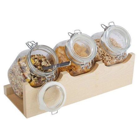 Stojan so zaváraninovými pohármi GOOD MORNING javor APS 13965 je praktické vybavenie pre bufet alebo kuchyňu, ktoré umožňuje estetické a pohodlné skladovanie a prezentáciu rôznych druhov potravín. Vyrobený z prírodného javorového dreva, vyznačuje sa elegantným vzhľadom a veľkou kapacitou. Ideálny na servírovanie raňajkových cereálií, sušeného ovocia, cukríkov alebo iných prísad počas hotelových raňajok, brunchov či rodinných stretnutí.